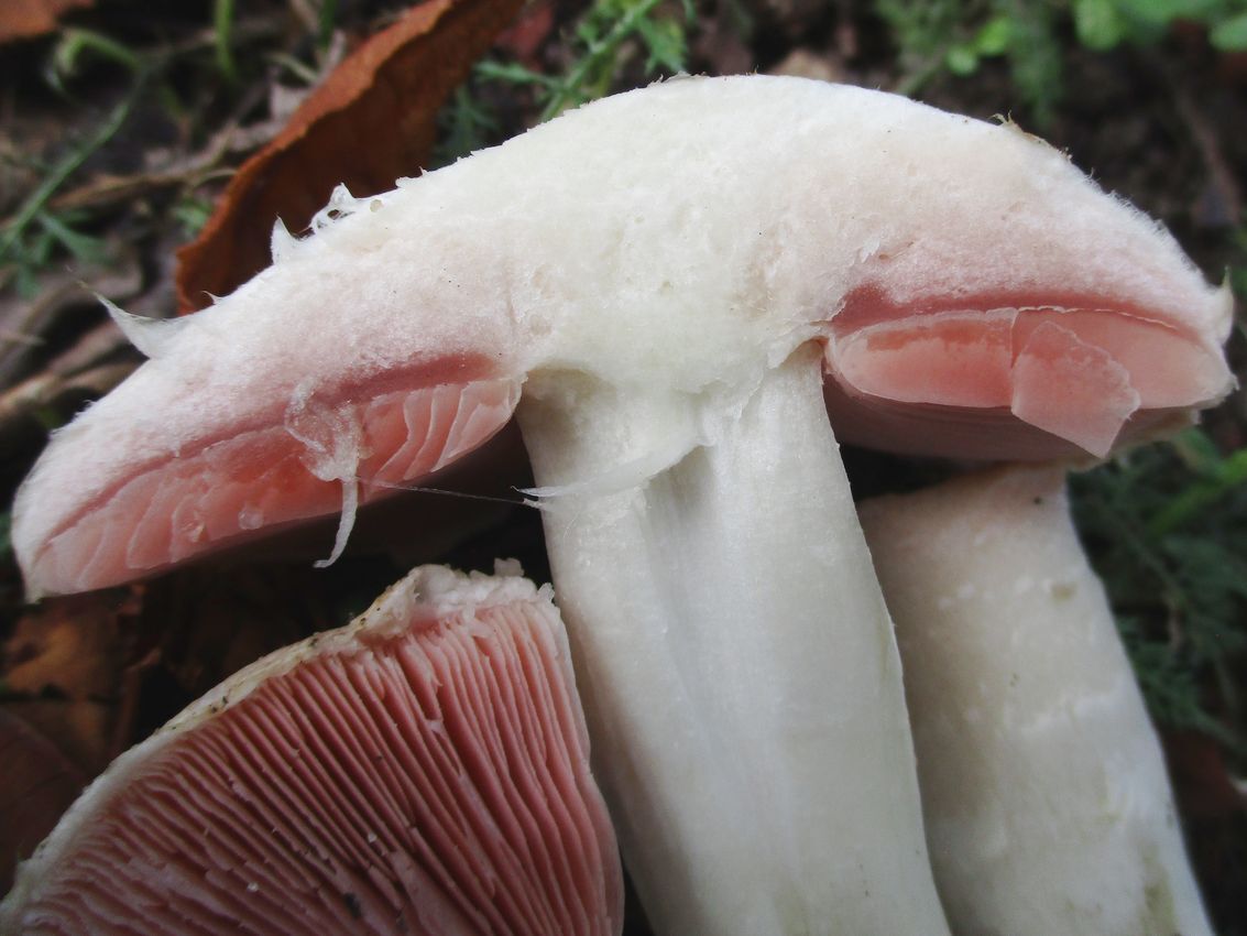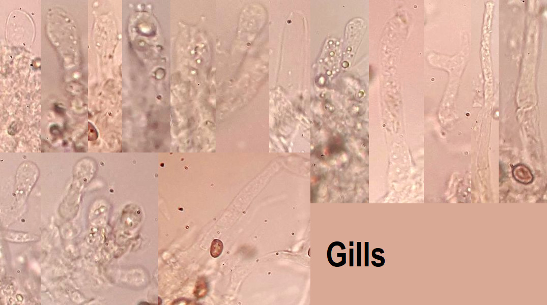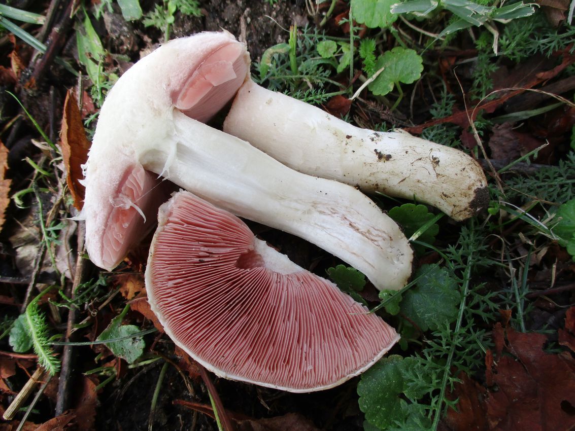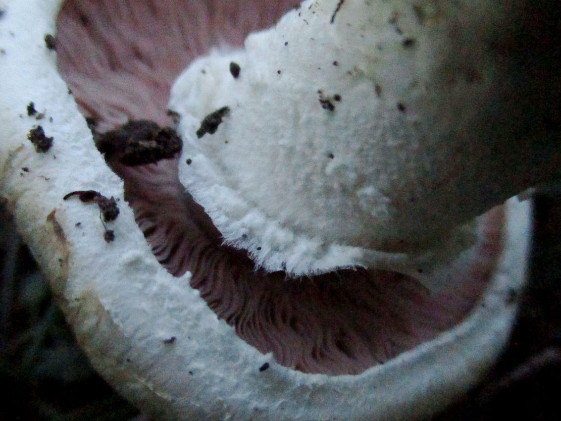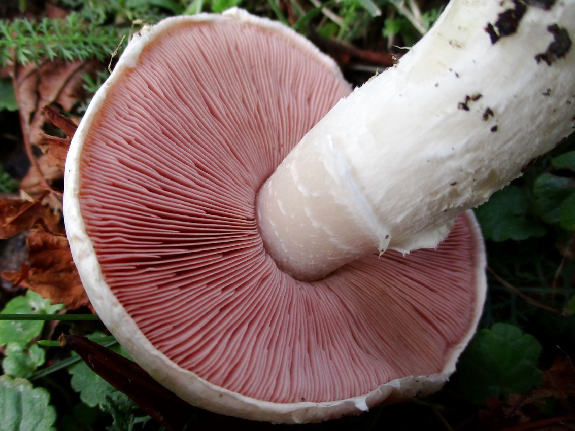 Lamellen: frei, jung rosa, lange rosa bleigend, dann lilabraun, später schwarz.