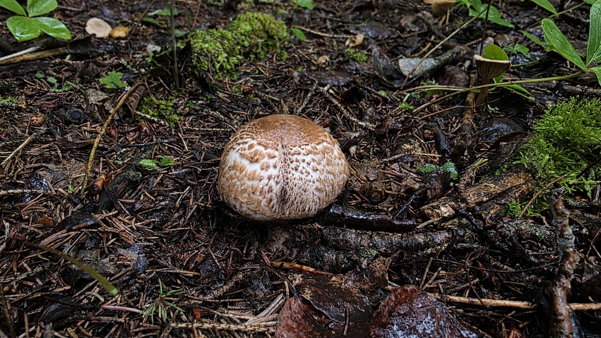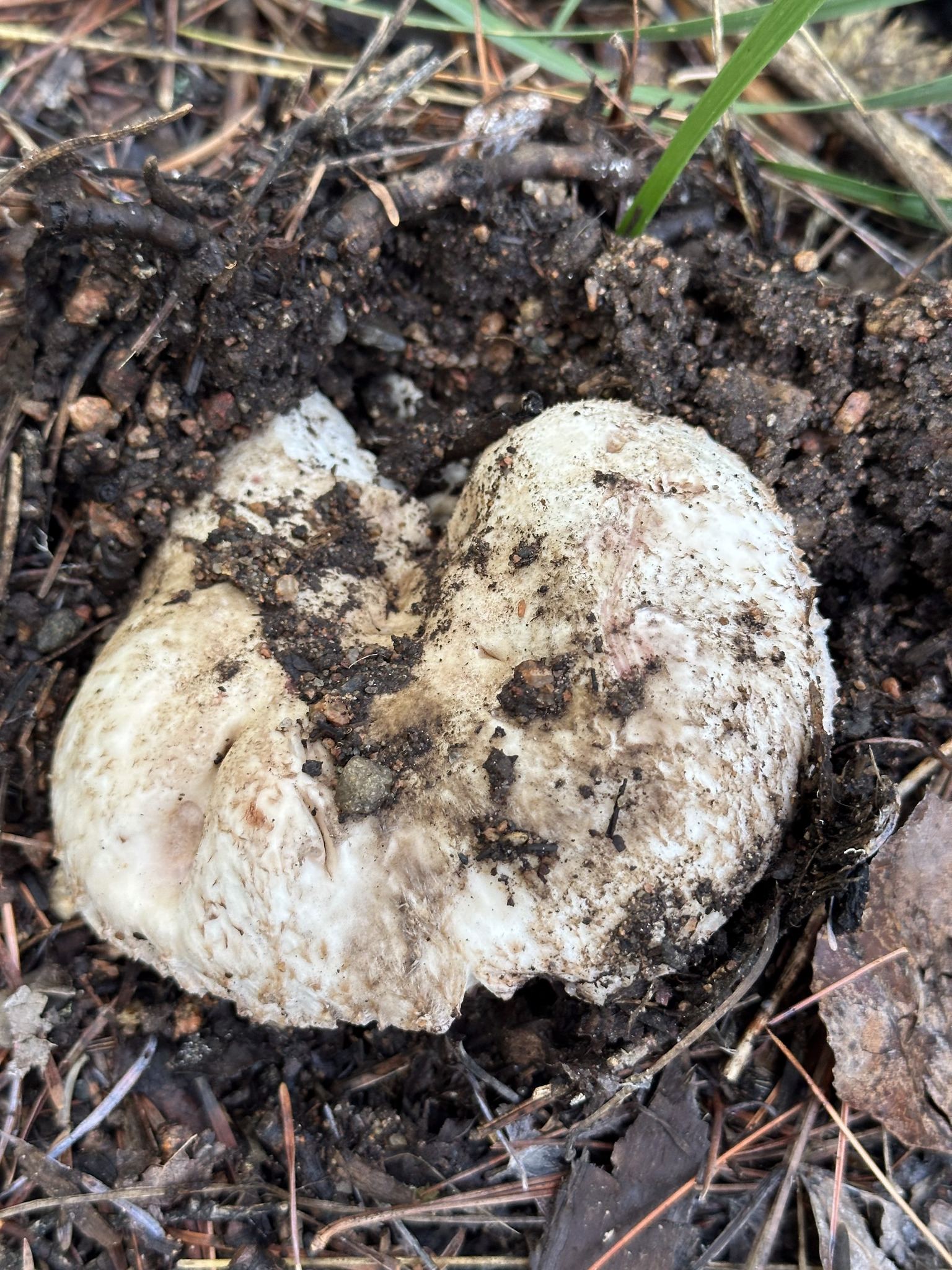 Hut: konvex bis weit ausgebreitet, weiss, mehr oder weniger kahl und matt, später fein bräunlich schuppig mit aufgerichteten Schuppen, nicht gilbend bei Druck,