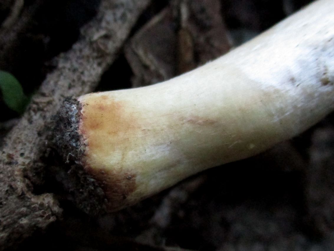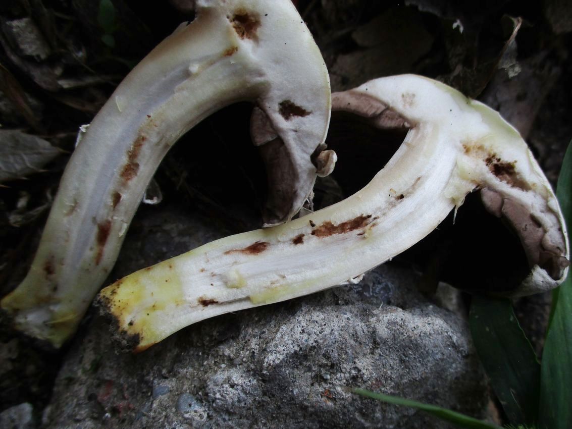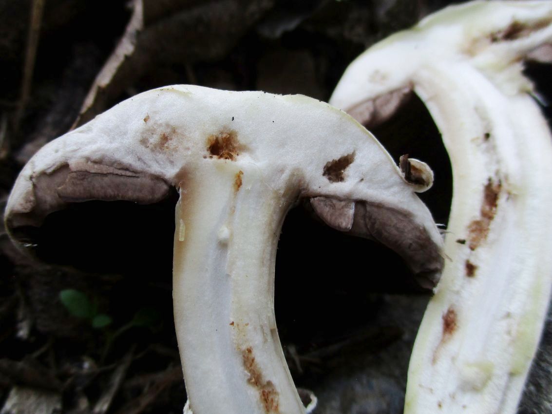 Fleisch: weiss bis weissgrau, in der Basis gilbend, nach einiger Zeit rötlich anlaufend. Sonst läuft das Fleisch gleich rötlich an