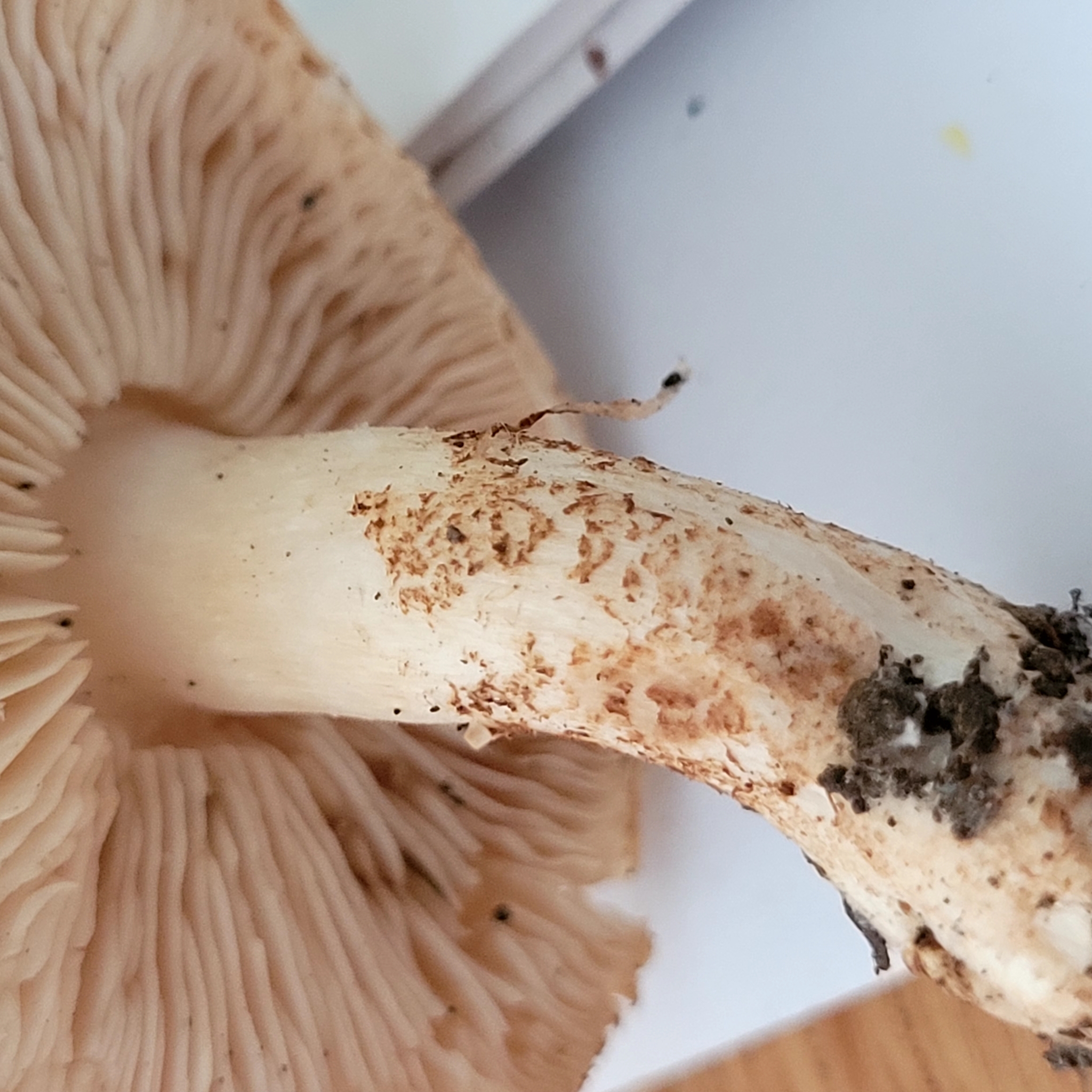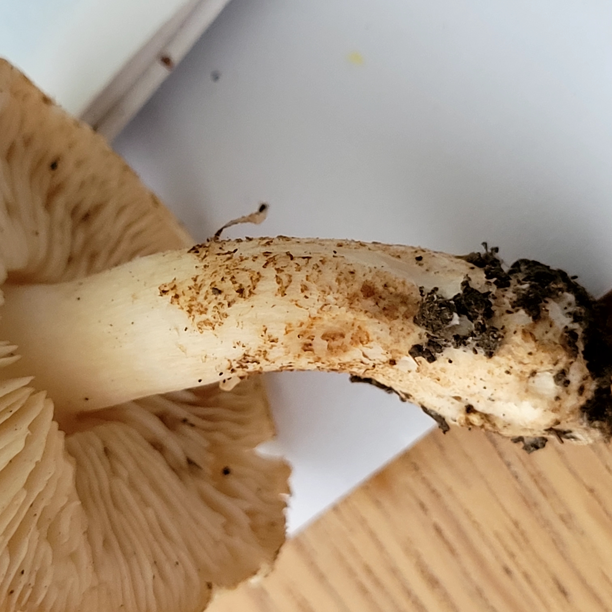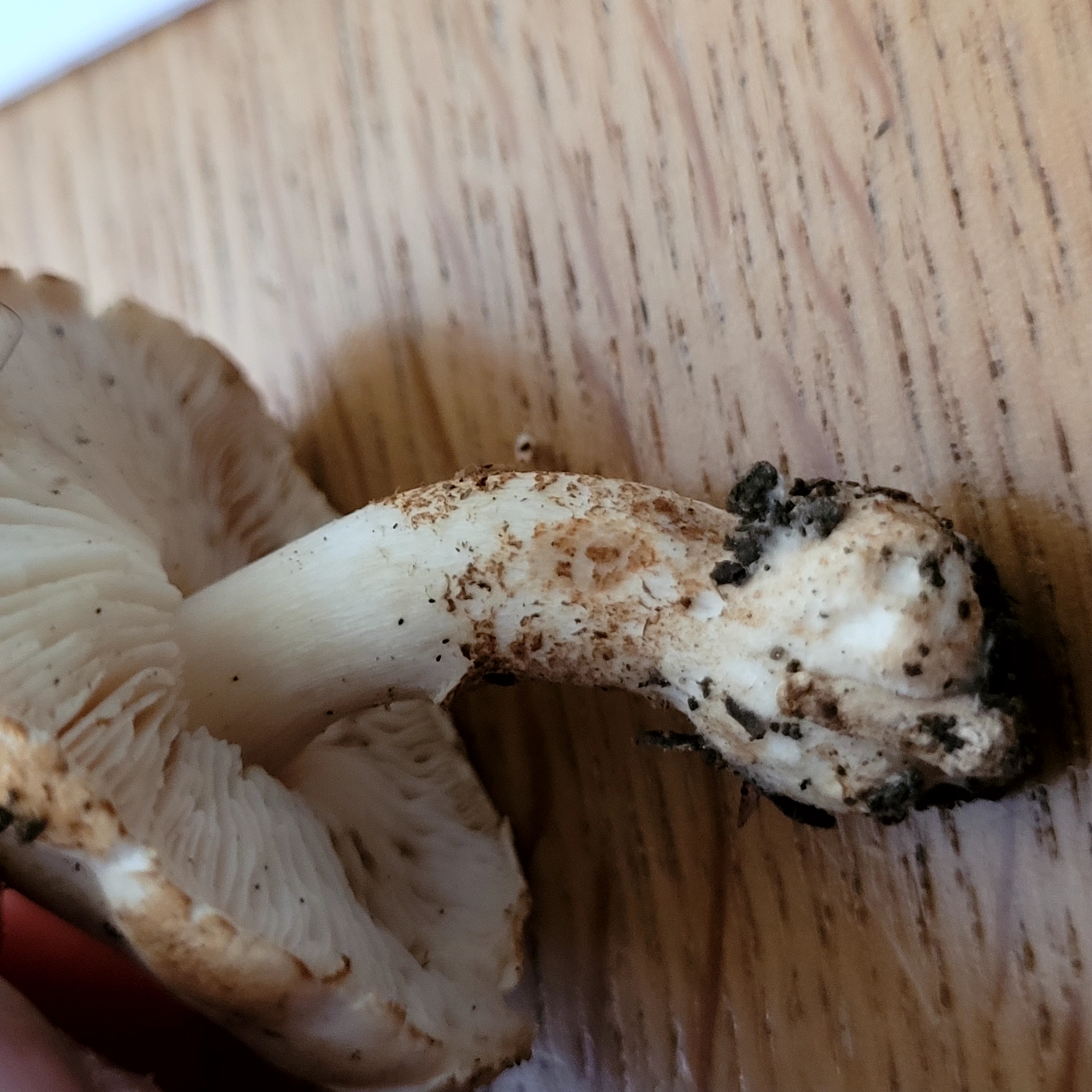 Stiel: jung voll, dann hohl, Spitze weisslich, Ring häutig abstehend, unterhalb des Ringes ocker gesprenkelt, jung mit bernsteinfarbenen Tropfen, oberhalb glatt.