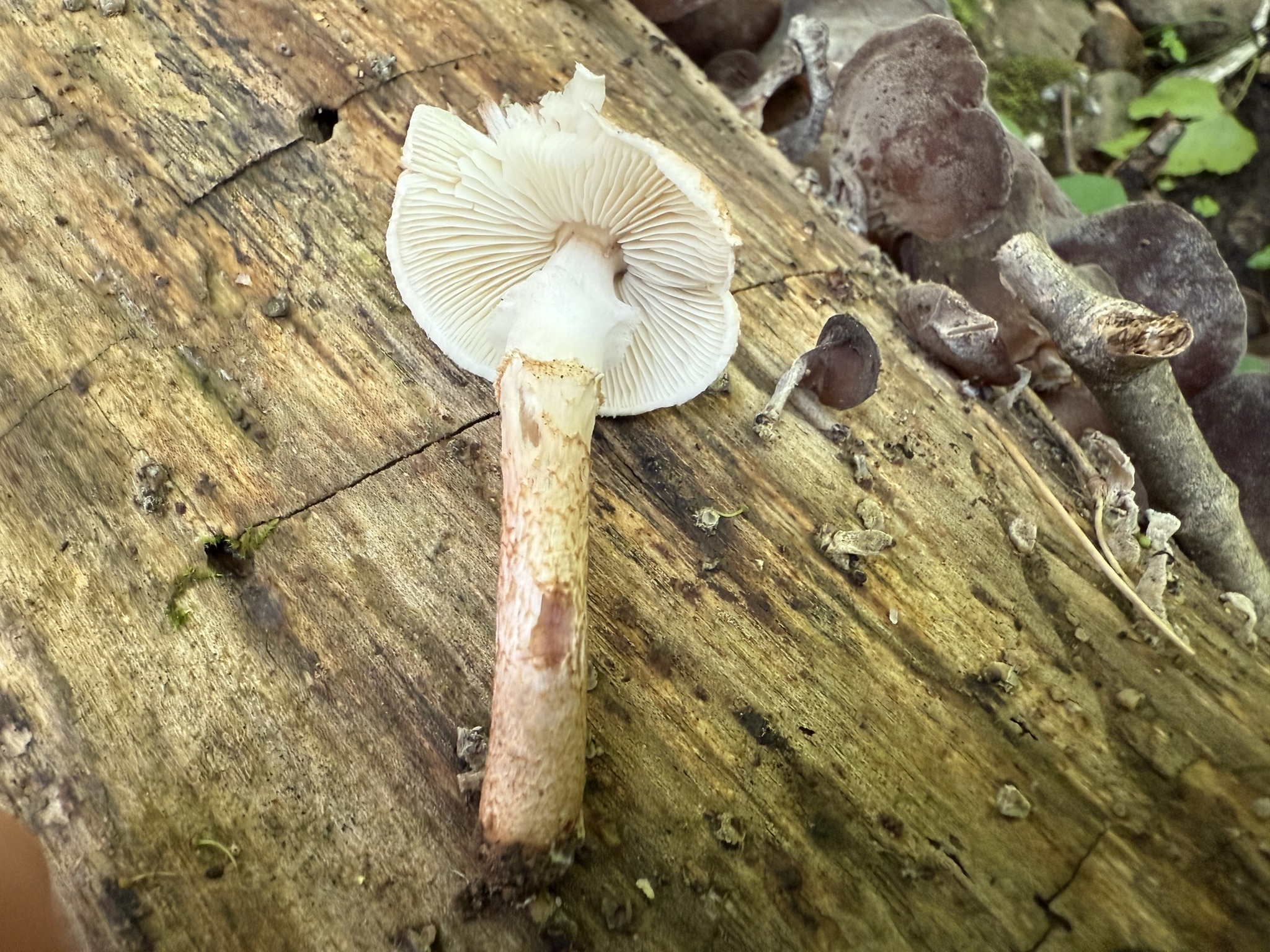 Stiel: zylindrisch, röhrig, Spitze weisslich, Ring flüchtig, weisslich häutig und aufsteigend, unterhalb des Ringes faserig-schuppig, in Hutfarbe schwach gegürtelt, Basis leicht knollig.