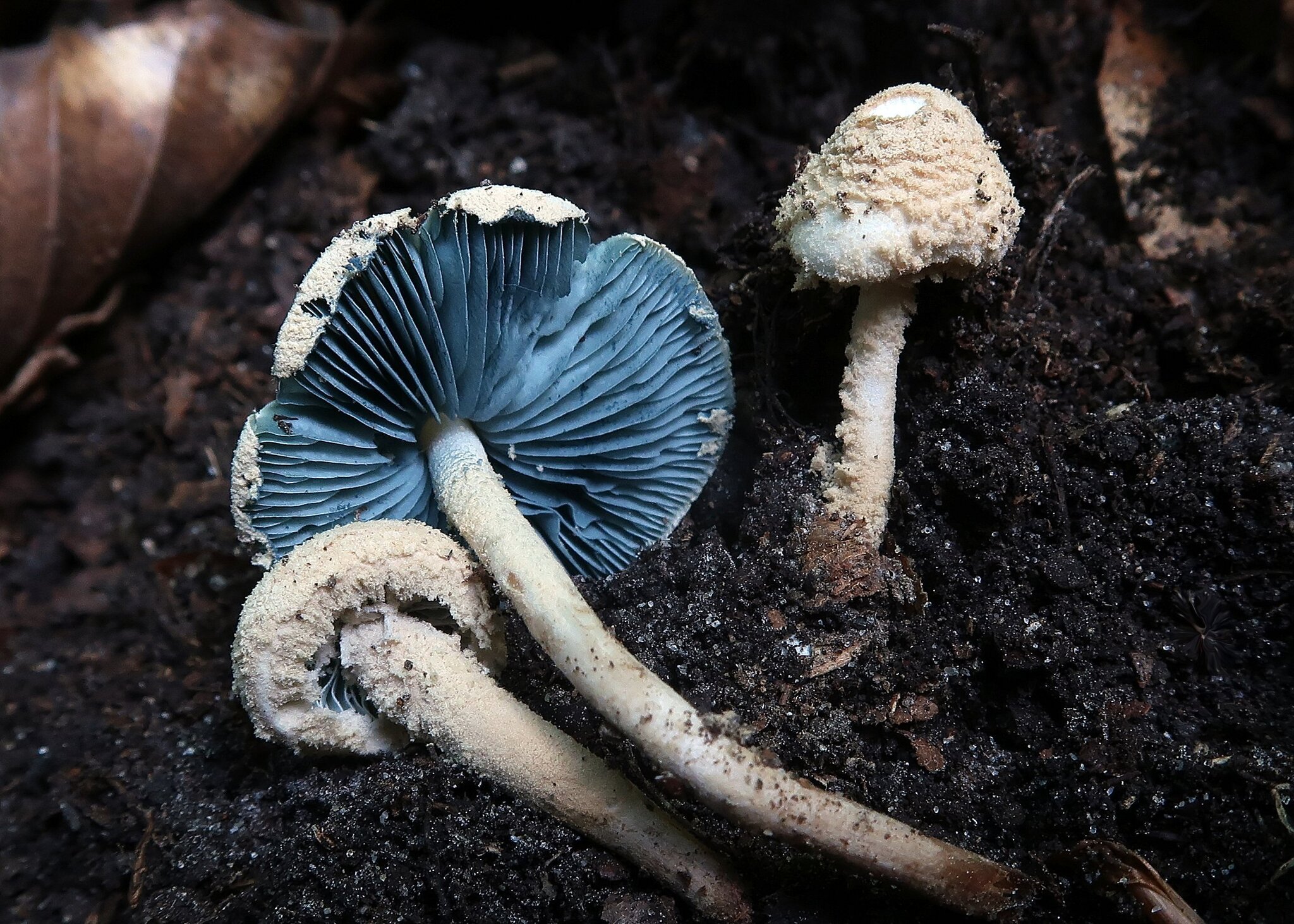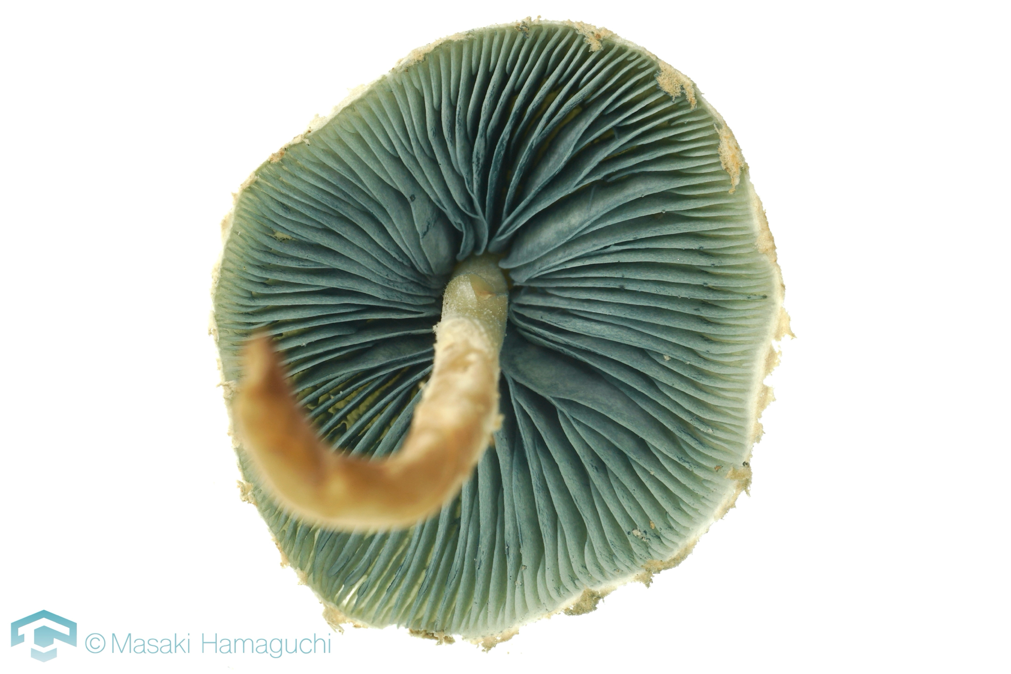 Hut 1—3 cm im Durchmesser, gewölbt bis glockenförmig; cremefarben mit ockerbraunem Zentrum; körnig, mit Schleierresten, die am Rand haften.Stiel 15—25x1—2 mm, farblich ähnlich wie der Hut, oft zur Basis hin dunkler werdend; körnig.Fleisch weiß im Hut, creme bis bräunlich im Stiel.Lamellen blaugrün.Sporen 4—5x2—2.5 µ, oval.Sporenabdruck blassgrün.Hutoberfläche bedeckt mit kugeligen, dünnwandigen Zellen.