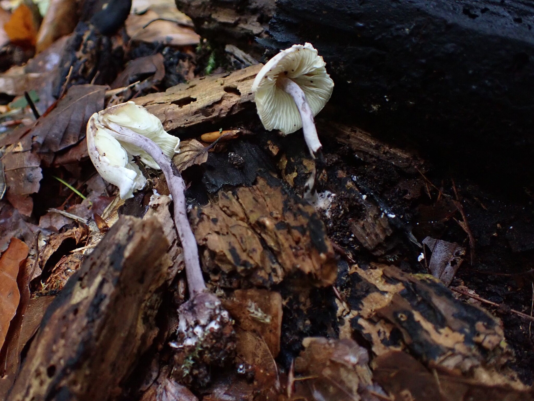 Hut 2—4 cm im Durchmesser, umbonat (mit einer Erhebung in der Mitte); weißlich mit einem Hauch von lila-violett, wenn jung; mehlig.Stiel 20—45x3—5 mm, blass an der Spitze, wird violett bis lila im unteren Bereich, besonders bei Druckstellen; mehlig.Fleisch weißlich bis lila; dünn; Geruch stark und erinnert an Gas-Teer.Lamellen frei; cremefarben.Sporen 7.5—10x3—3.5 µ, länglich-ellipsoid; schwach dextrinoid.Sporenabdruck weiß.Cheilocystidien nicht differenziert.Hutoberfläche besteht aus kugeligen, dünnwandigen Zellen.
