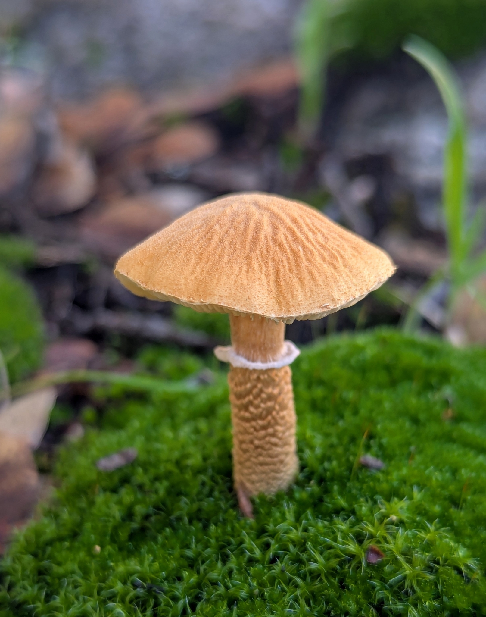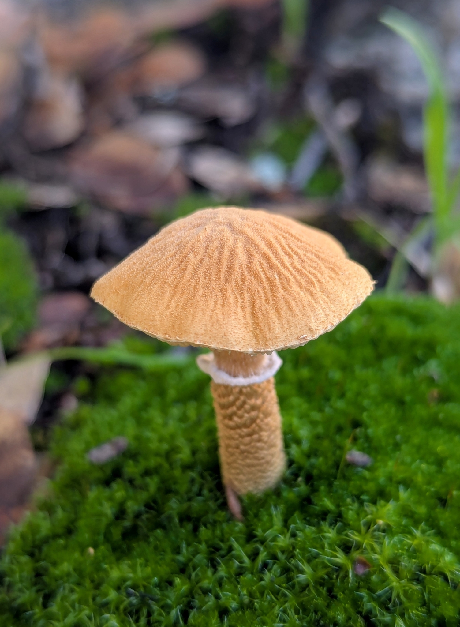 Stiel: zylindrisch, Spitze glatt bis bereift, blass, Ring dauerhaft, häutig, Ringunterseite und ab Ring Stielabwärts rostbraun bis ocker körnig, sonst wie der Hut gefärbt.