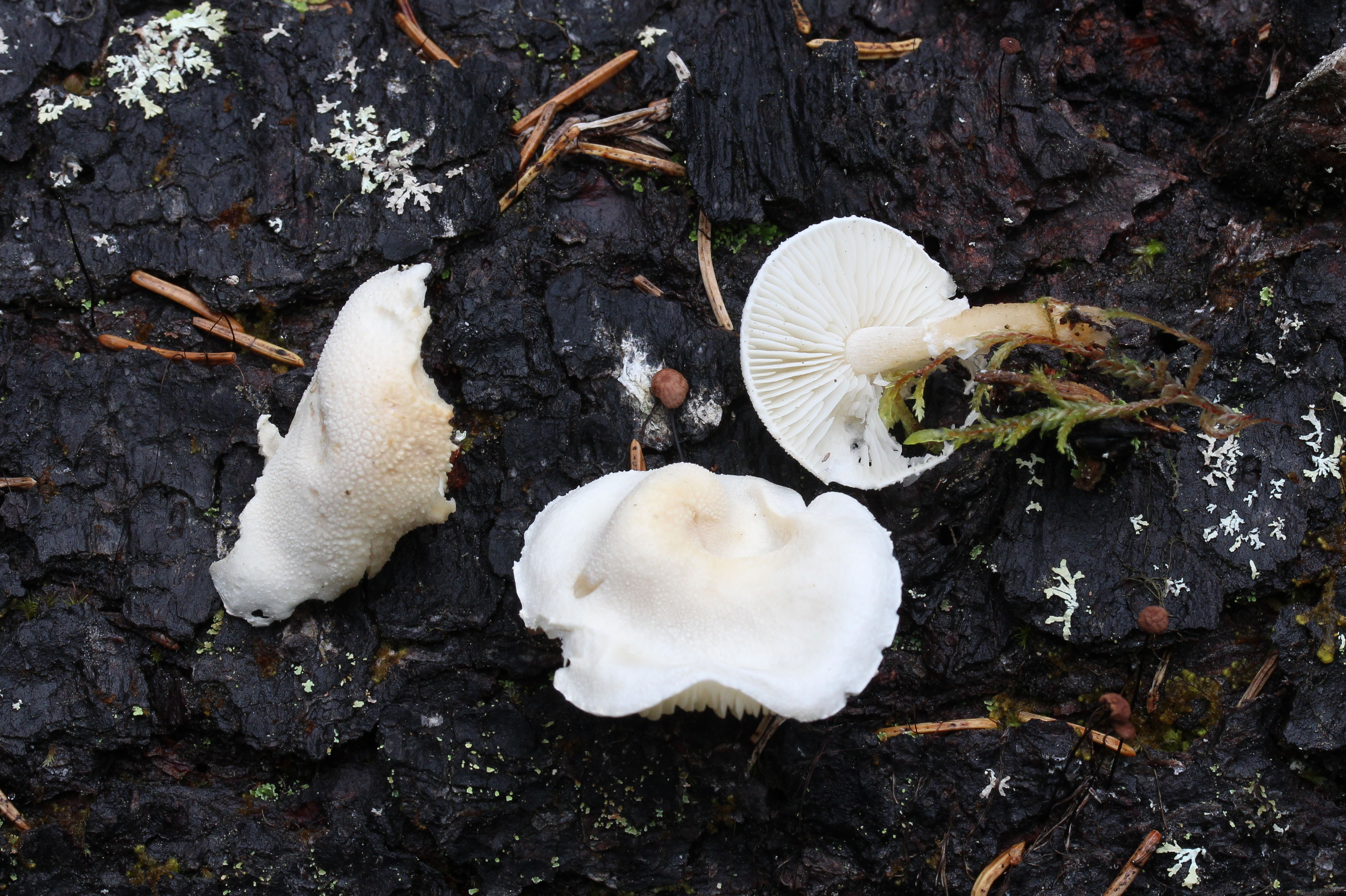 Hut: jung halbkugelig gewölbt, dann ausgebreitet, körnig, weiss, später verkahlend, Mitte bisweilen gelblich, Rand behangen.