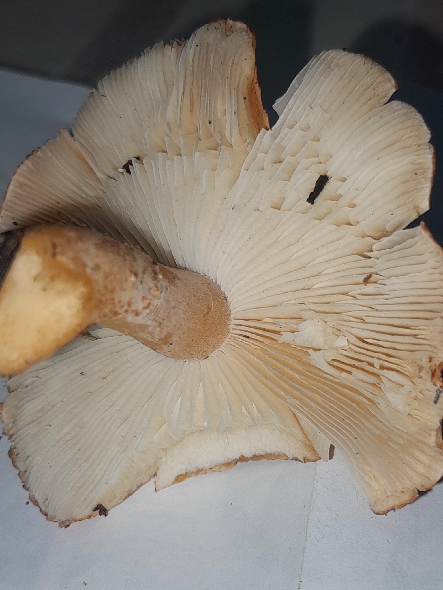 Stiel: Stiel voll, etwas knollig, unterhalb des häutig- schuppigen Ringes rot - schuppig.