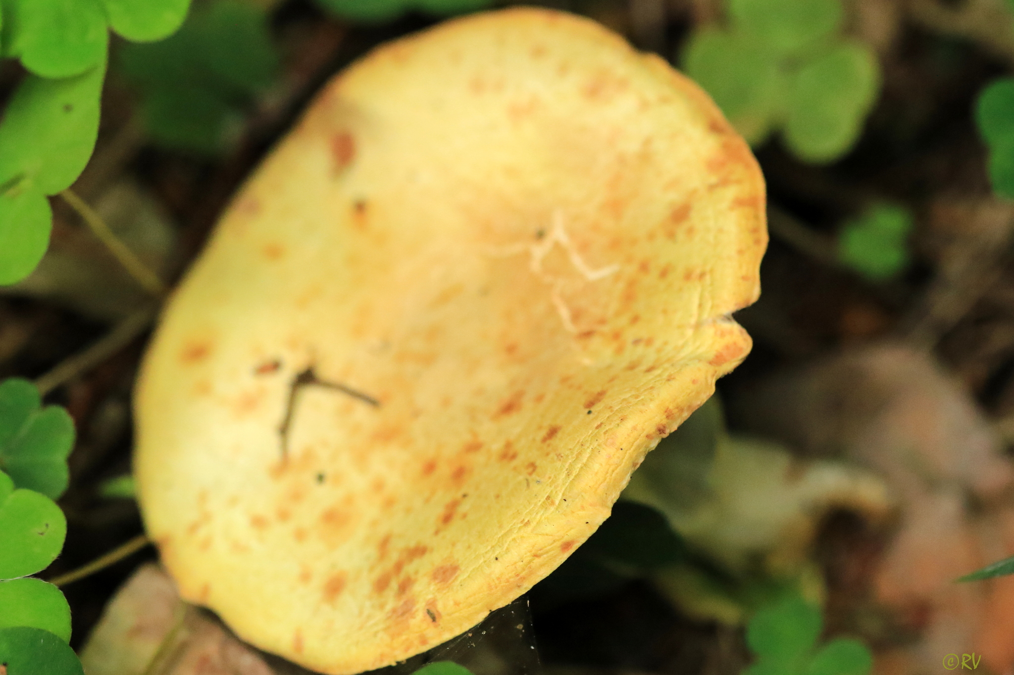 Hut: jung halbkugelig dann konvex bis flach, trocken, durchgängig gelbbraun bis orangebraun, glimmerig-feinkörnig, Rand behangen