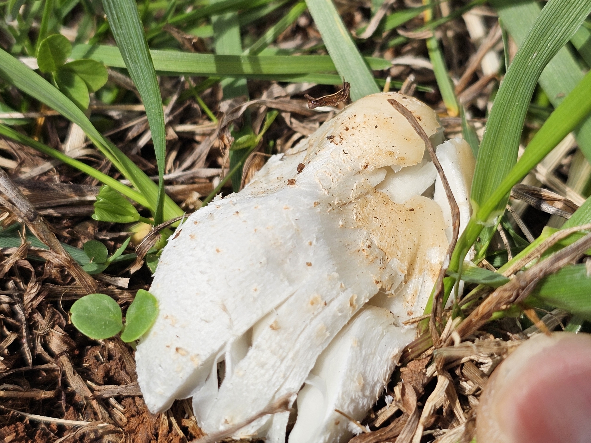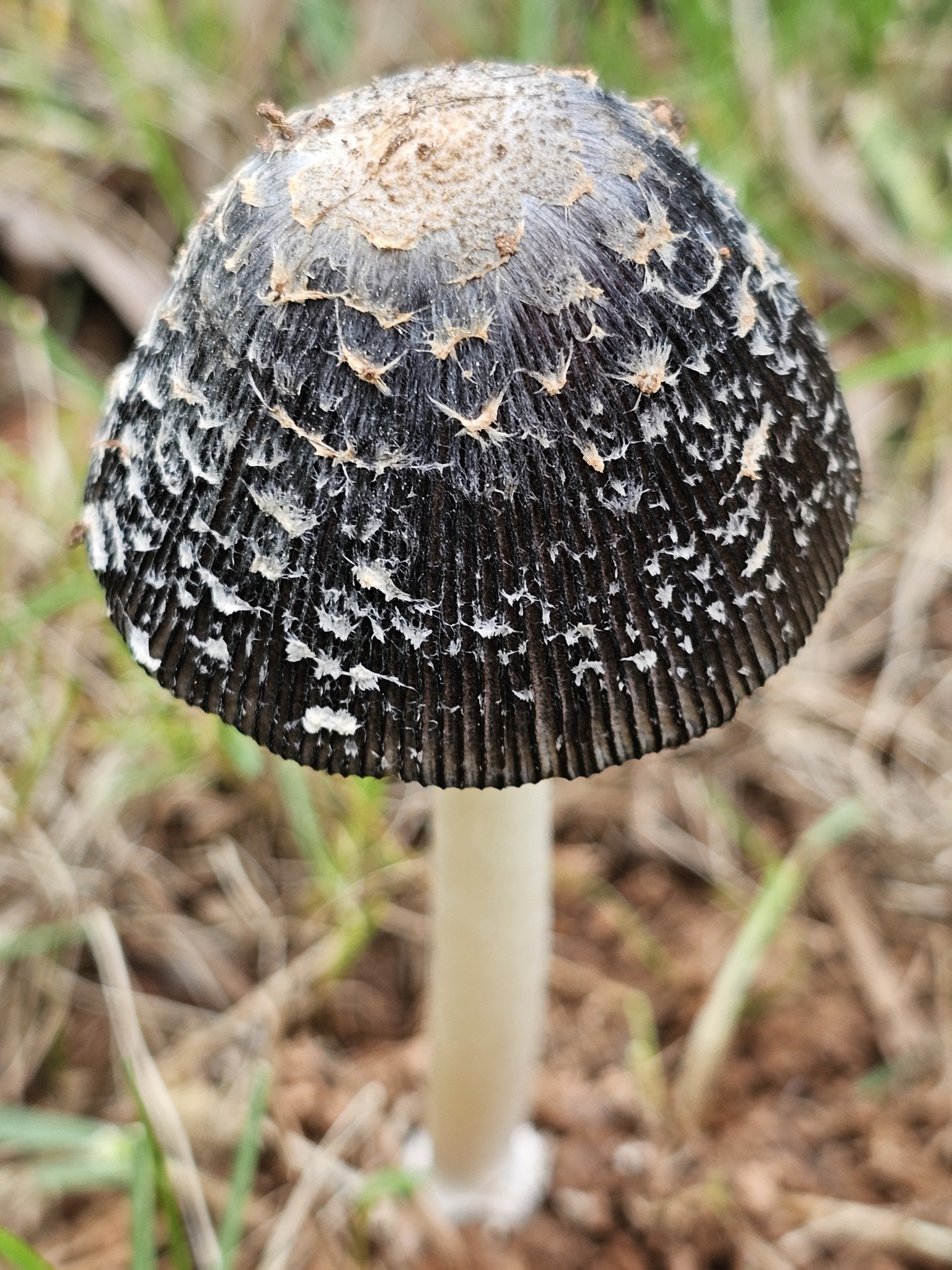 Hut: jung walzenförmig zylindrisch, später kegelförmig ausgebreitet, gefurcht, dicht flockig-faserig mit sparrig-schuppigem Zentrum, weisslich bis blass ockerlich, Rand alt zunehmend schwarz aufgerollt, zerfliessend.