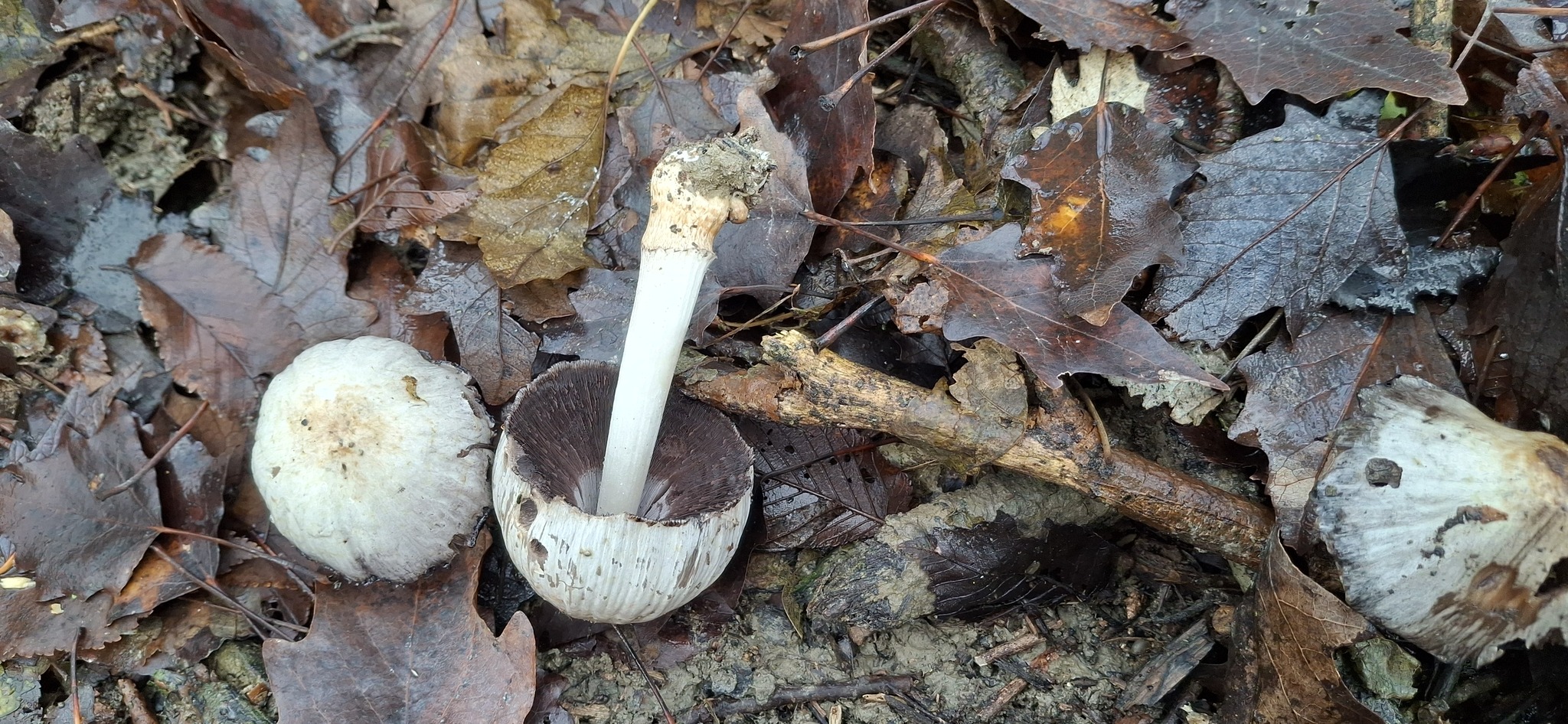 Stiel: Stiel weisslich, hohl, Basis leicht verdickt und mit scheidenartigem Ring, feinfaserig