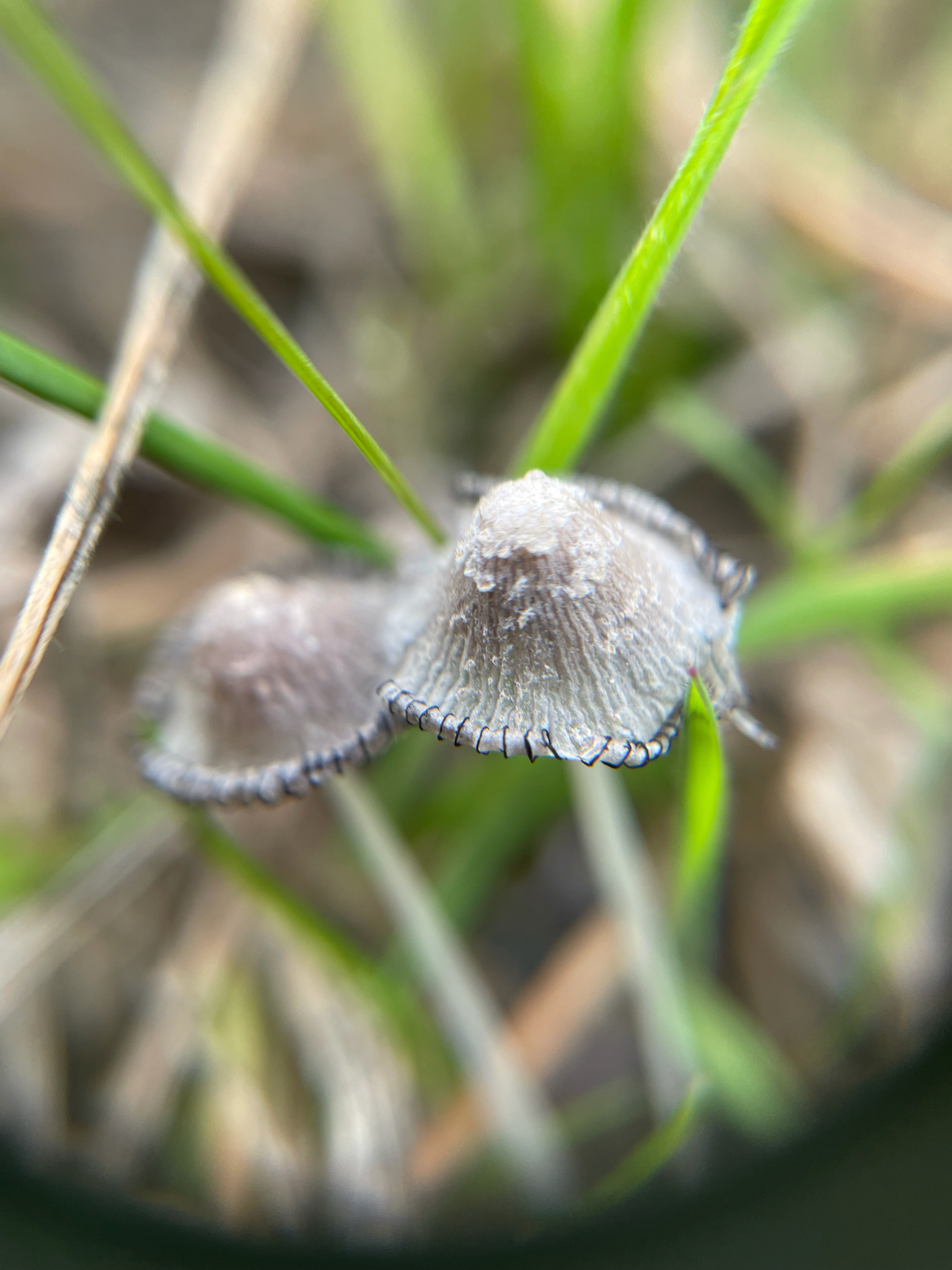 Hut: sehr zart, fast zylindrisch, glockig, weisslich flockige Velumreste auf blassem, später graubraunem Grund, Rand grau-violett, gerieft.