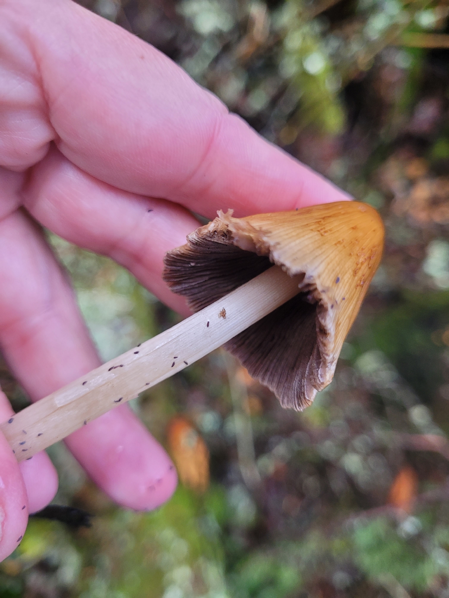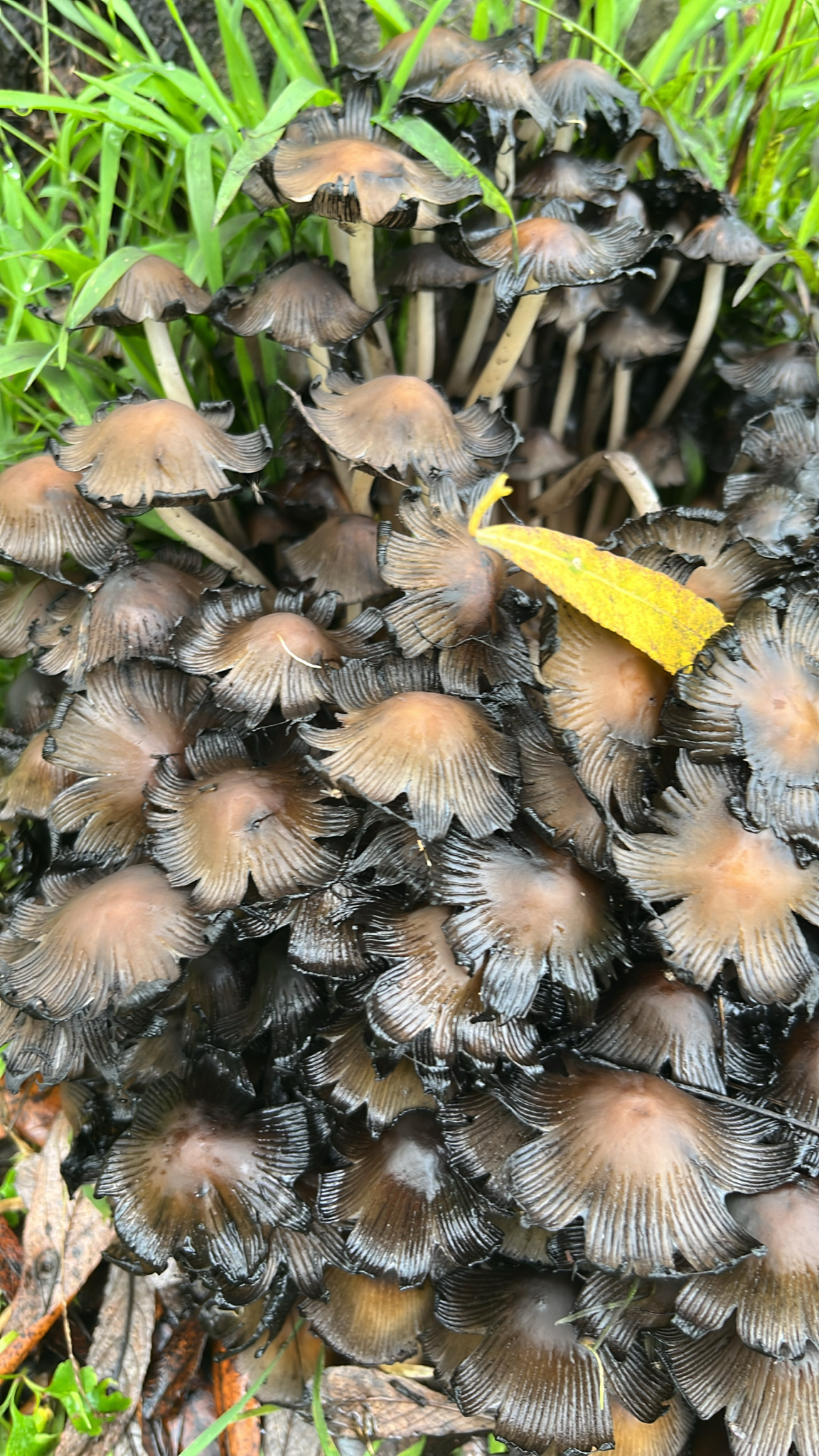 Lamellen: abgerundet, angeheftet, bis frei, weisslich, später graubraun mit hell bewimperten Schneiden, schliesslich schwarz und zerfliessend