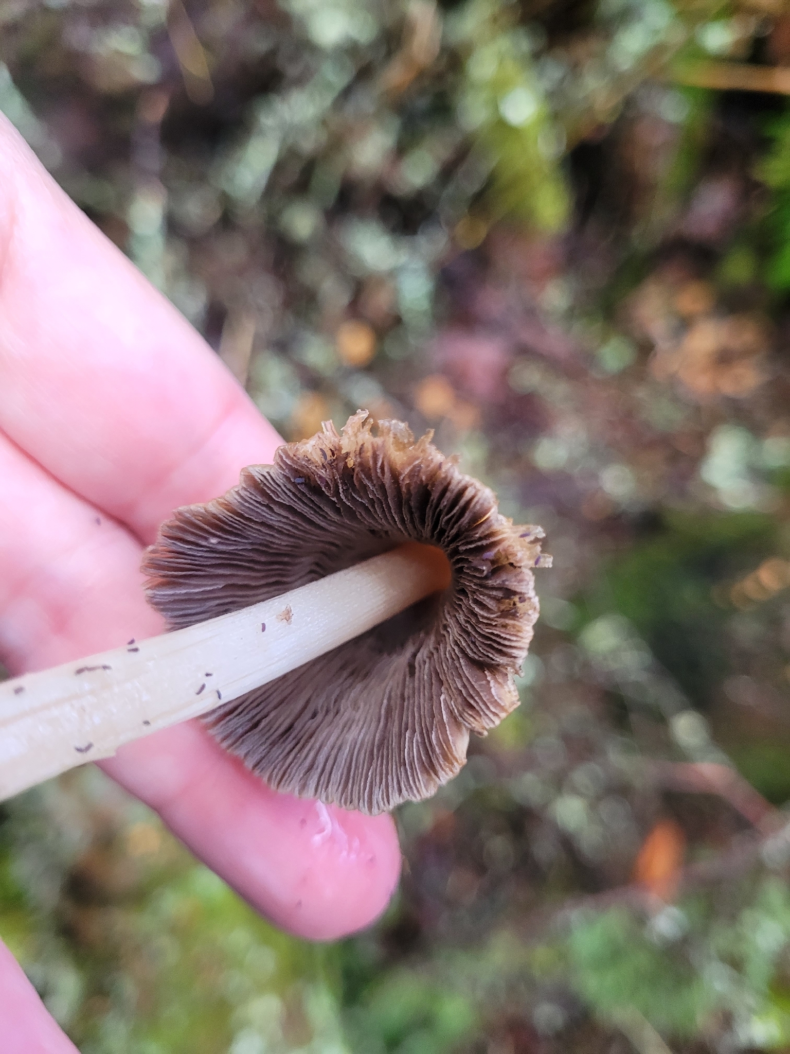 Stiel: zylindrisch, hohl, weisslich, Basis evtl. schwach verdickt, jung vergänglich feinflockig überzogen, seidig glänzend