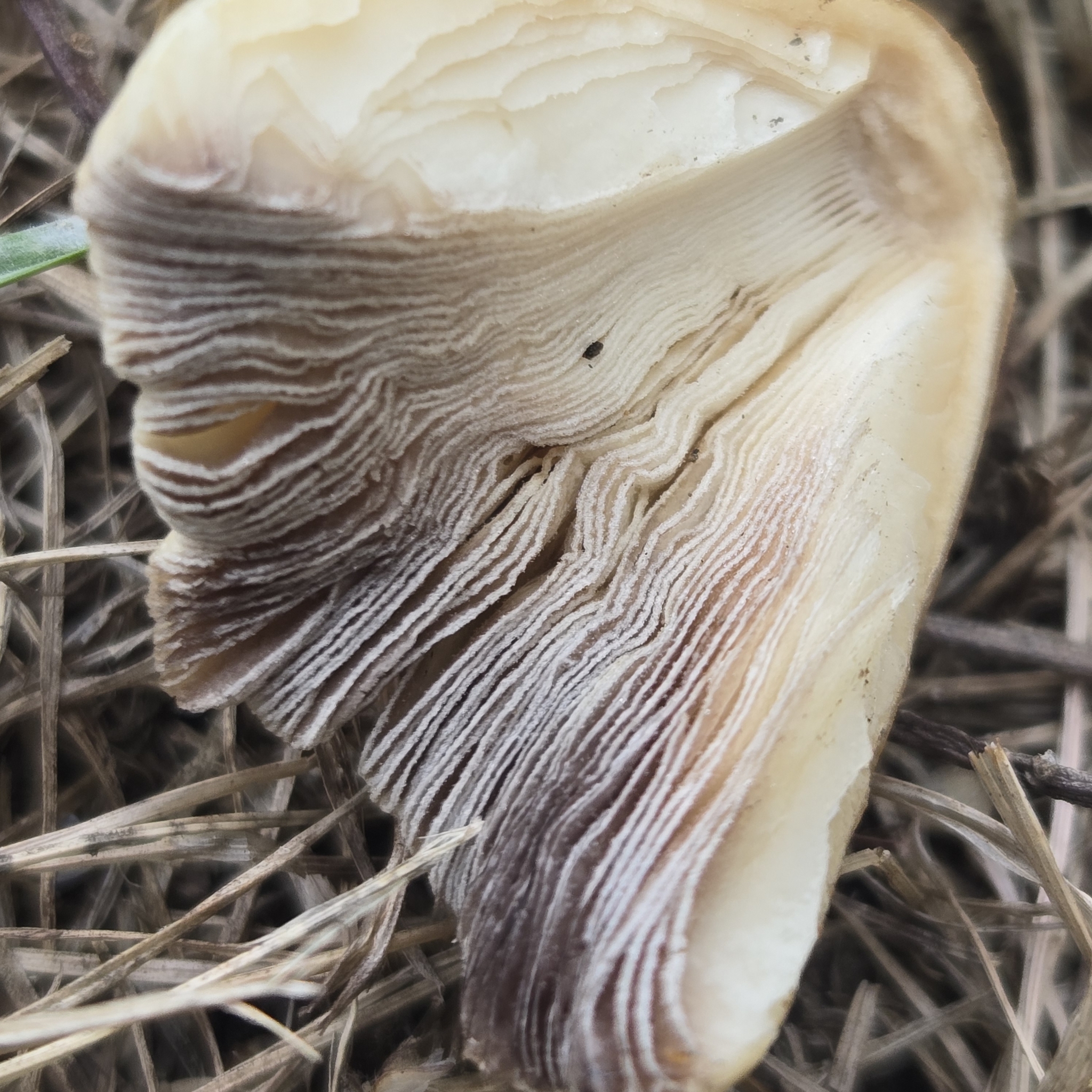 Lamellen: fast frei bis frei, weisslich, später graubraun mit hell bewimperten Schneiden, schliesslich schwarz.