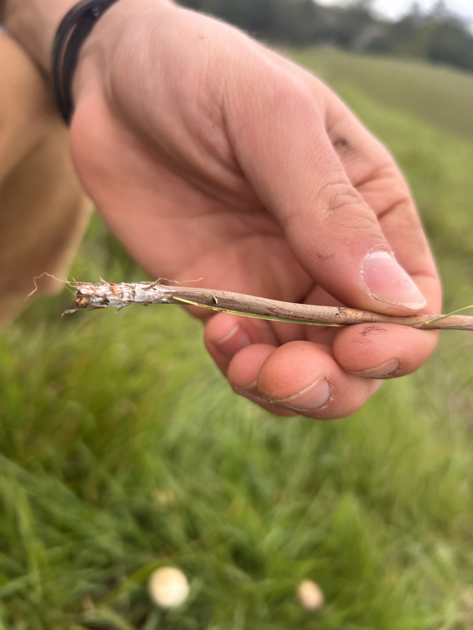 Stiel: sehr dünn, blassgrau flaumig auf rötlichgrauem bis graubraunem Grund, Spitze heller, u.U. leicht rötlich, zur Basis dunkler werdend