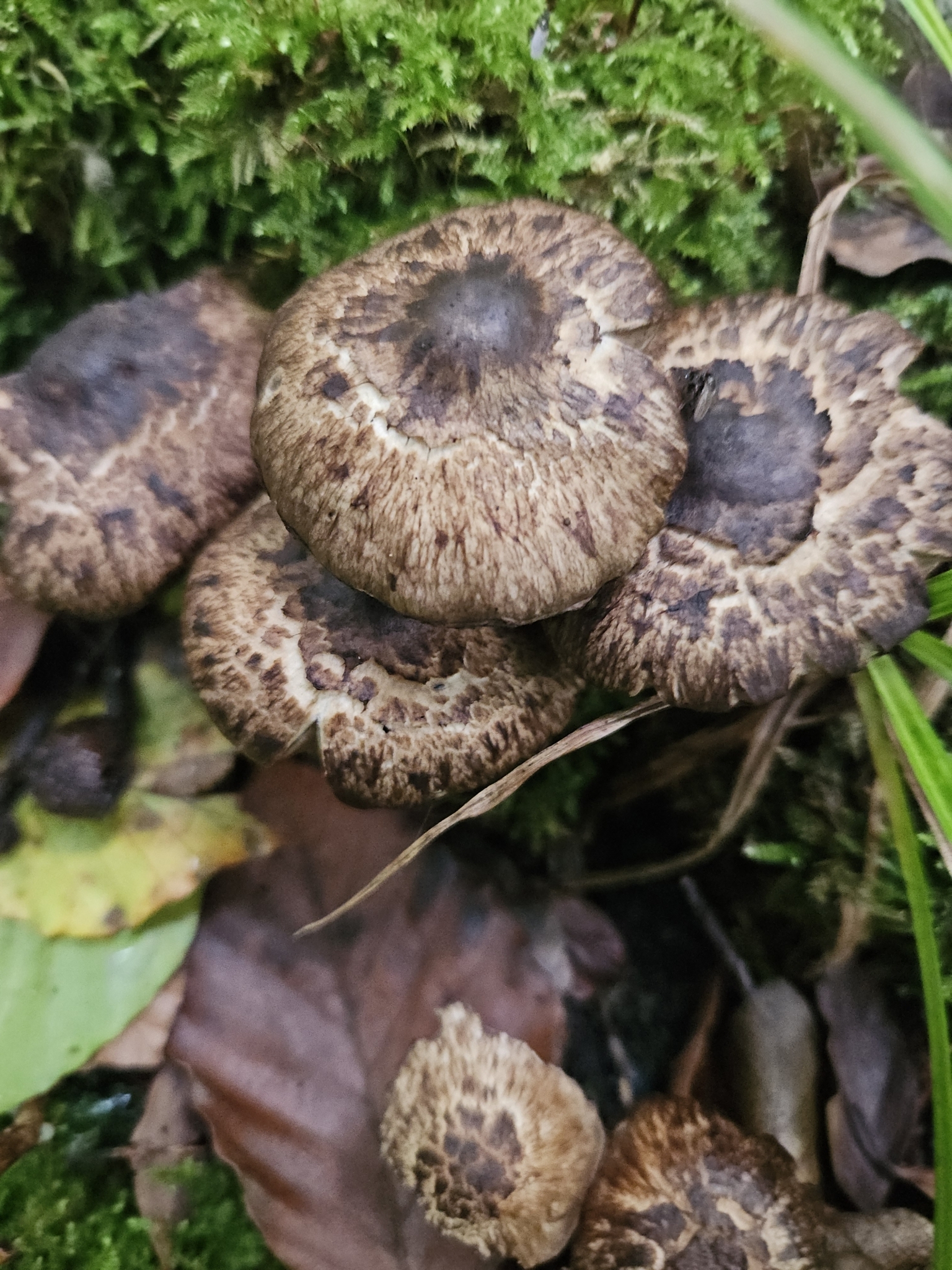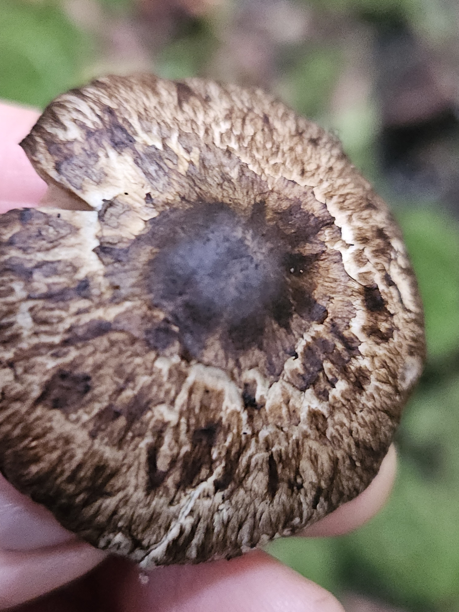 Hut: jung kegelig glockig gewölbt, schliesslich flach gewölbt, braun, ausblassend, mit braunen bis schwarzbraunen Schüppchen fleckig, mit vergänglichen weisslichem Velum gesäumt