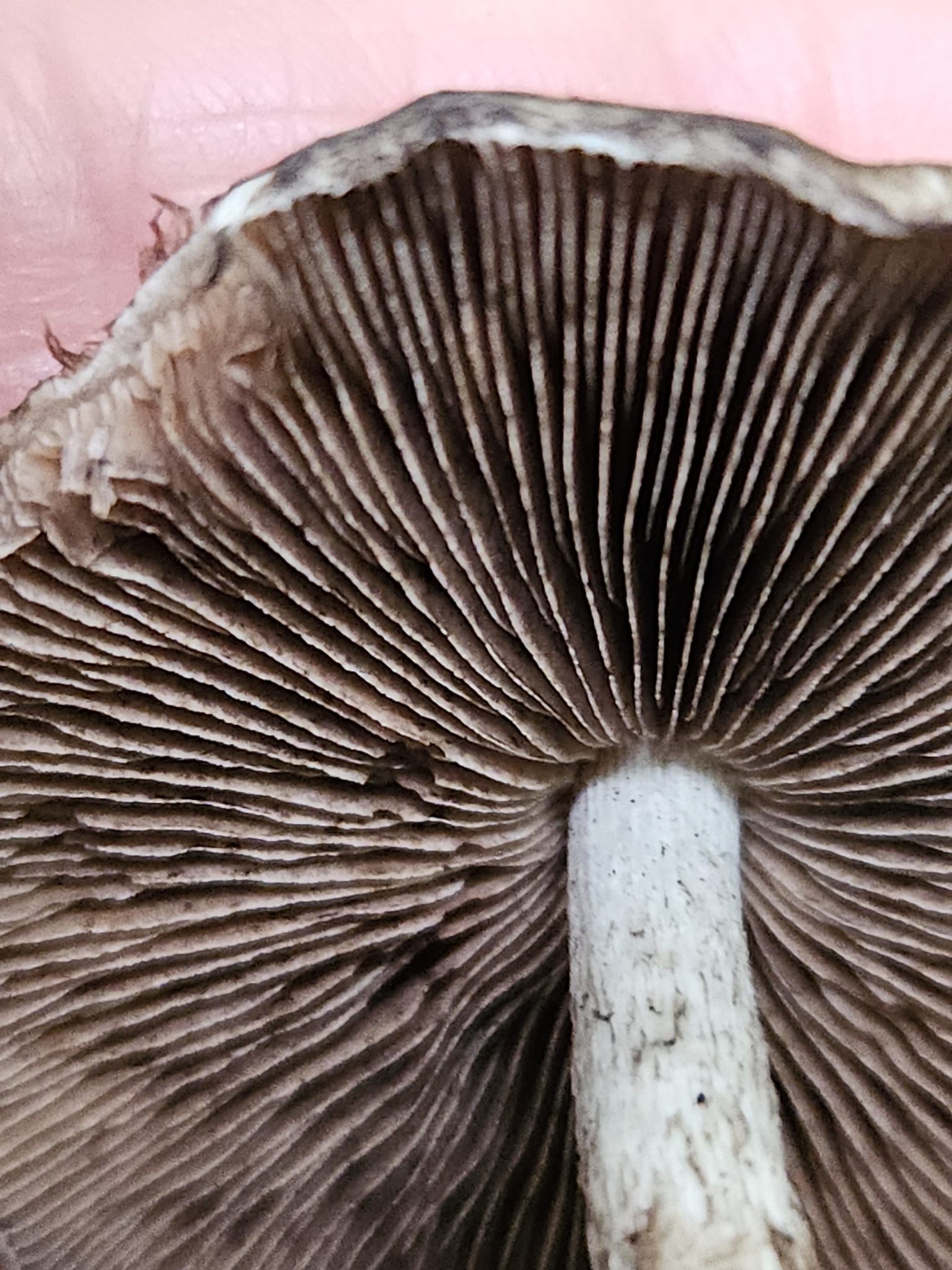 Lamellen: erst blass, später braunviolett bis schokoladenbraun, Schneiden weisslich gefranst, fast gedrängt, bauchig, angeheftet angewachsen.