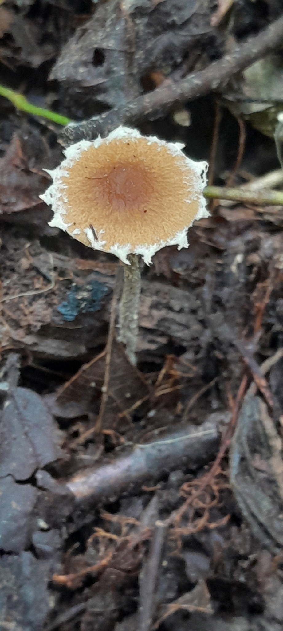 Hut: glockig-kegelig, dann gewölbt und evtl. gebuckelt, ockerbraun bis rötlichocker, Rand auffällig mit vergänglichen weissen Velumfetzen behangen, später kahl, evtl. etwas gerieft.