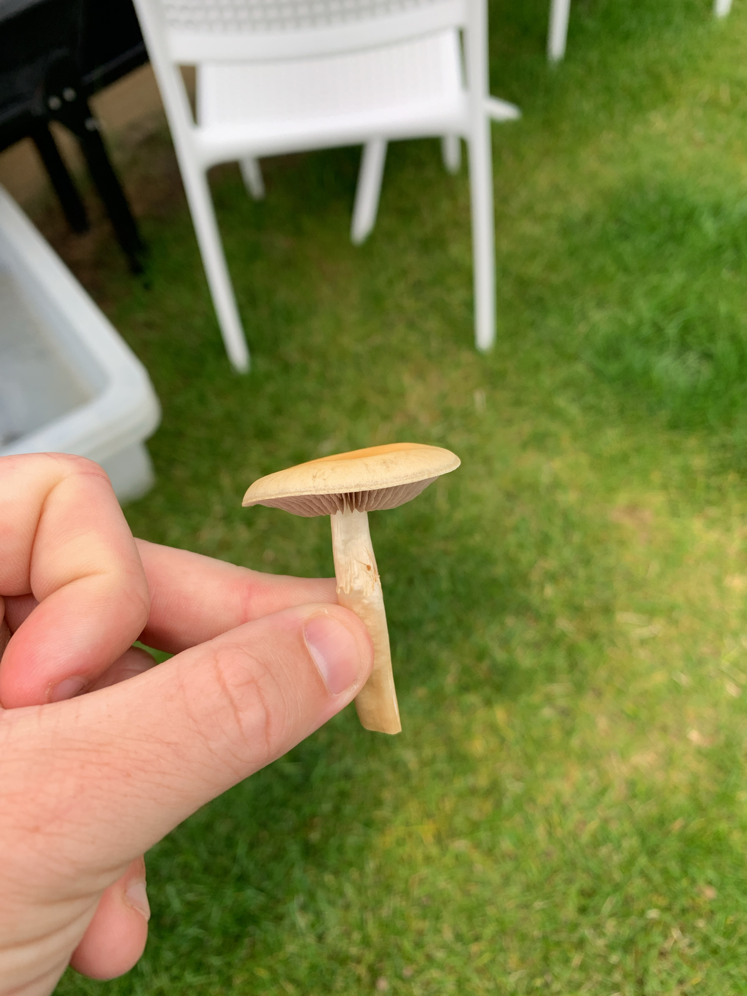 Lamellen: Schneide gezahnt, leicht ausgebuchtet, angewachsen, weisslich, später schmutzigbraun mit hellerem Rand