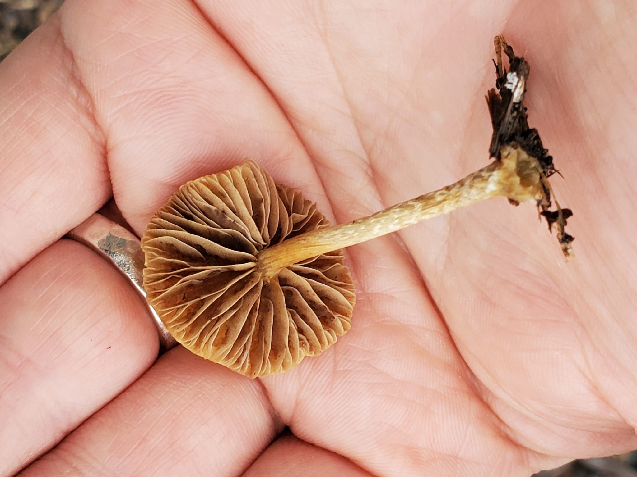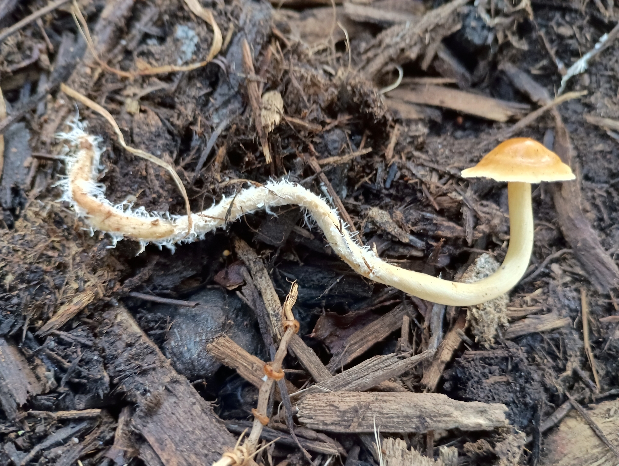 Stiel: hart bis elastisch, lang, ockergelblich, wurzelnd und mit vergrabenem kleinen schwarzen Sklerotium (Knolle) bis Erbsengrösse verbunden.