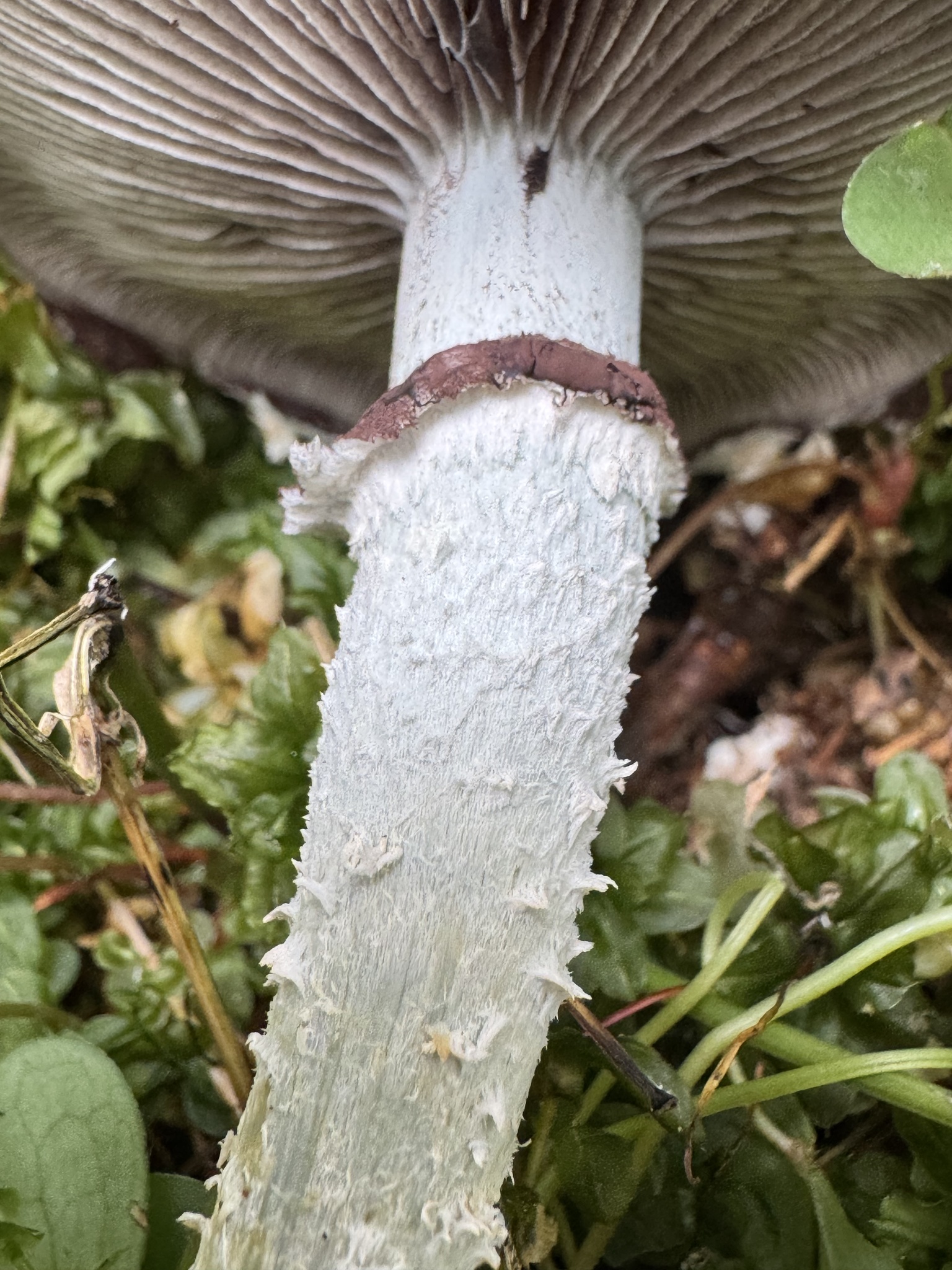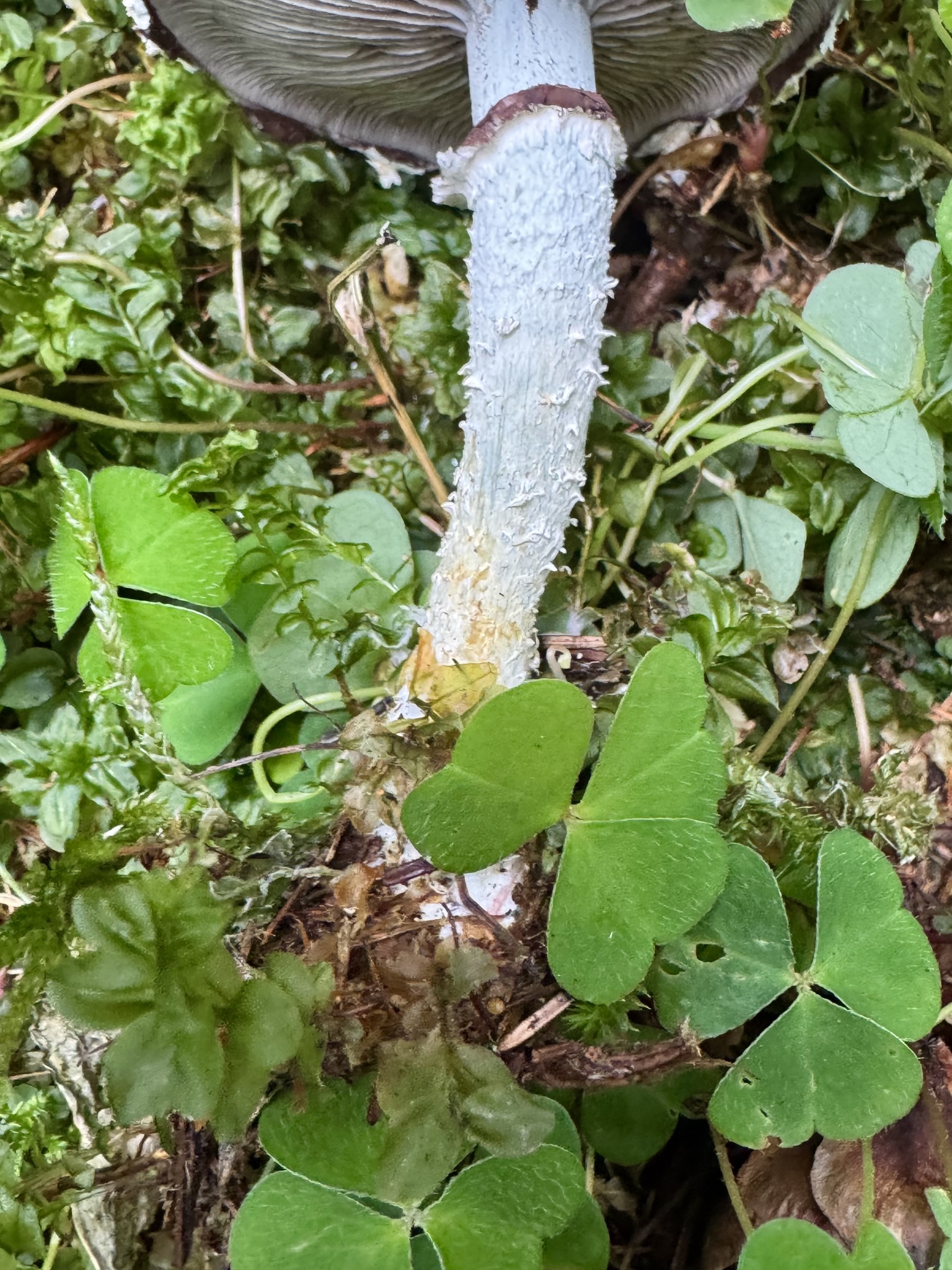 Stiel: blaugrünlich, zylindrisch, oft verbogen, an der Spitze und unter dem Ring dicht mit weissen Flocken besetzt, Ring häutig, n.