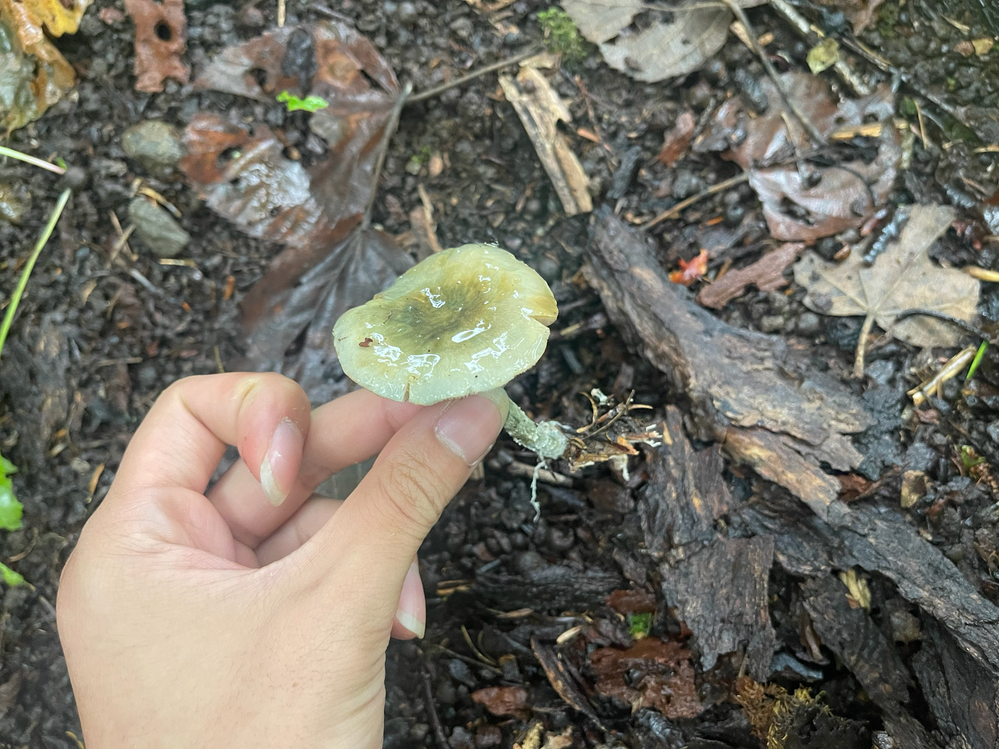 Hut: jung kegelig-glockig mit eingerolltem Rand, später gewölbt bis flach, jung dunkel blaugrün und schmierig-schleimig mit im Schleim schwimmenden weissen Flocken, später trocknend und zu ocker-gelblich verblassend