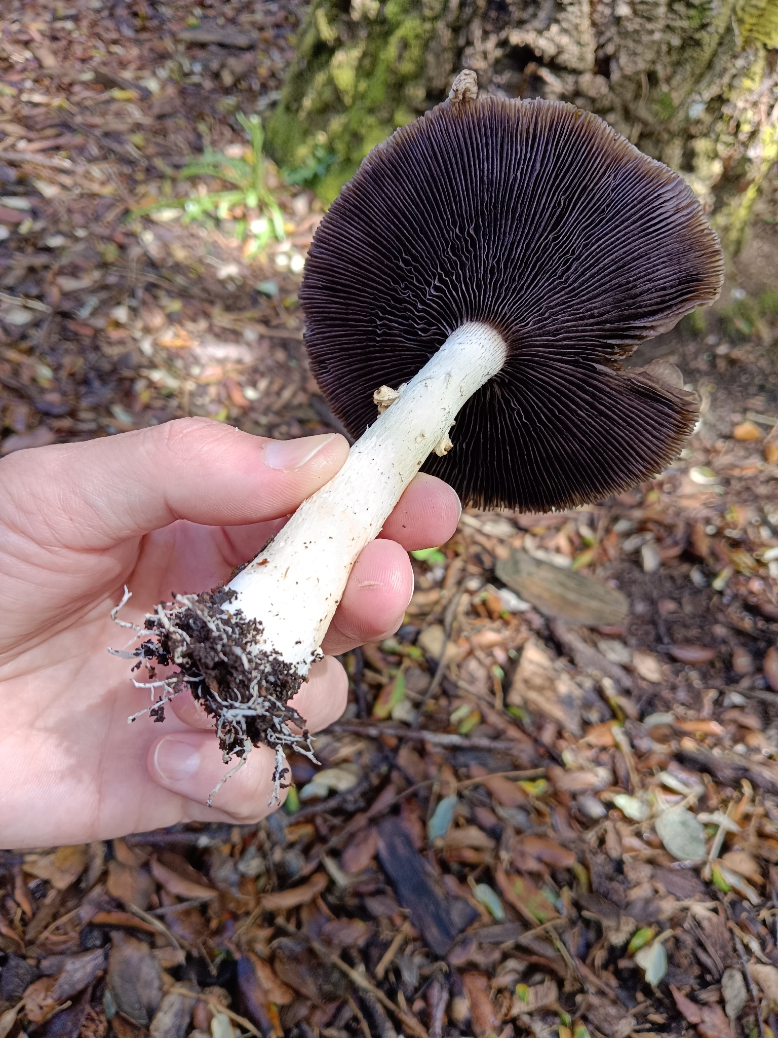 Stiel: weiss, auf der ganzen Länge glatt, Ring runzelig gerieft, Basis verdickt, Basis oft mit myzelfäden behangen, Ring membranös, weiss, bald schwarz von Sporen und radial in Segmente gespalten