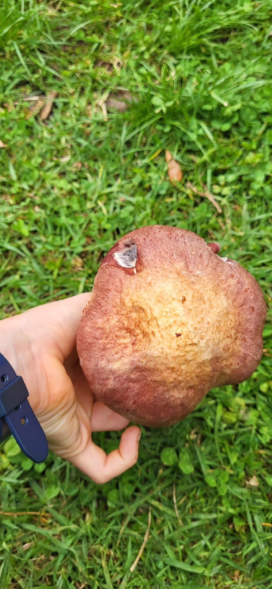 Hut: glockig, konvex, später flach, kahl, trocken, kaum schmierig, variable Farbe, rotbraun, weinrötlich bis bräunlich, oft wolkig.