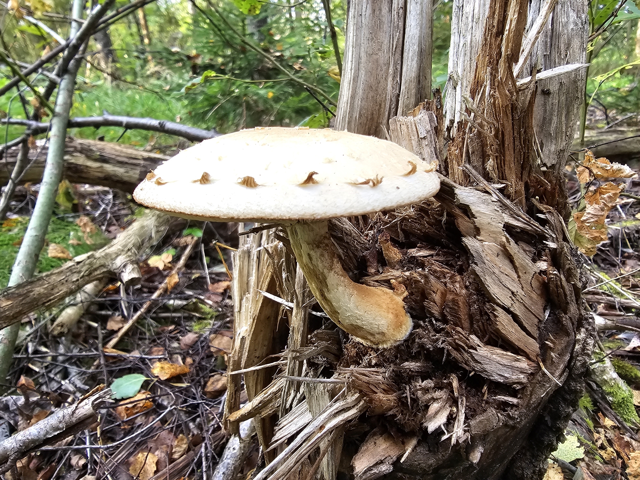 Stiel: voll, recht kurz, hart, auch wurzelnd, faserig, blass weisslich mit angedeutetem vergänglichen Ring, darunter etwas flockig.