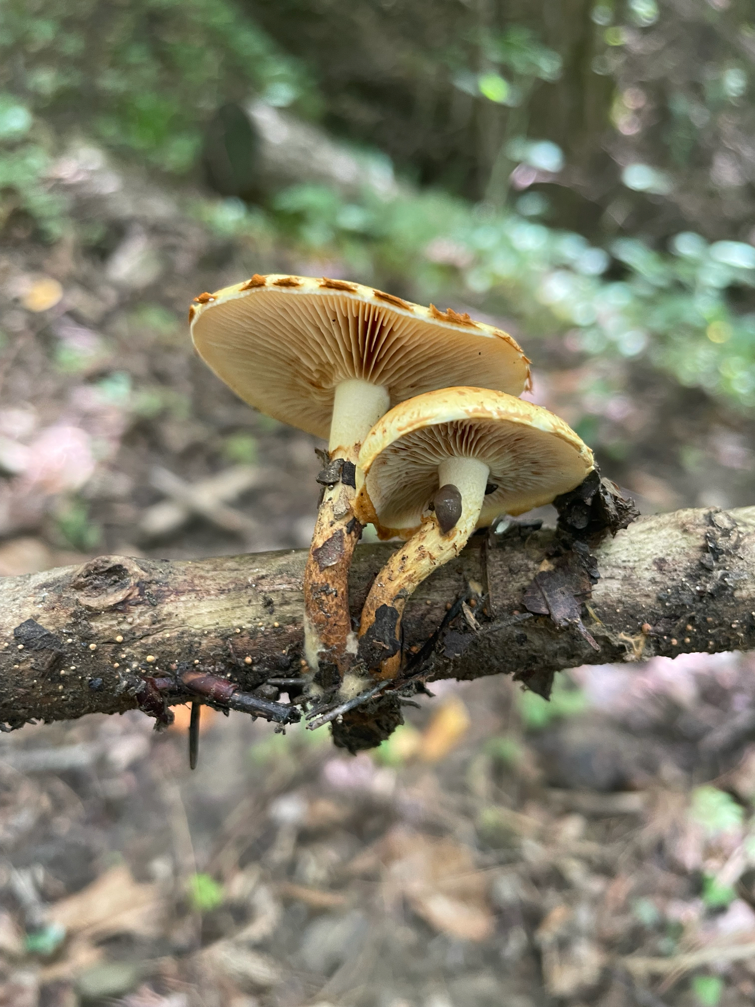 Stiel: voll, Basis schwach knollig, rostbraun, oberhalb des aufsteigenden, flüchtigen Ringes weiss mehlig, unterhalb des Ringes schuppig.