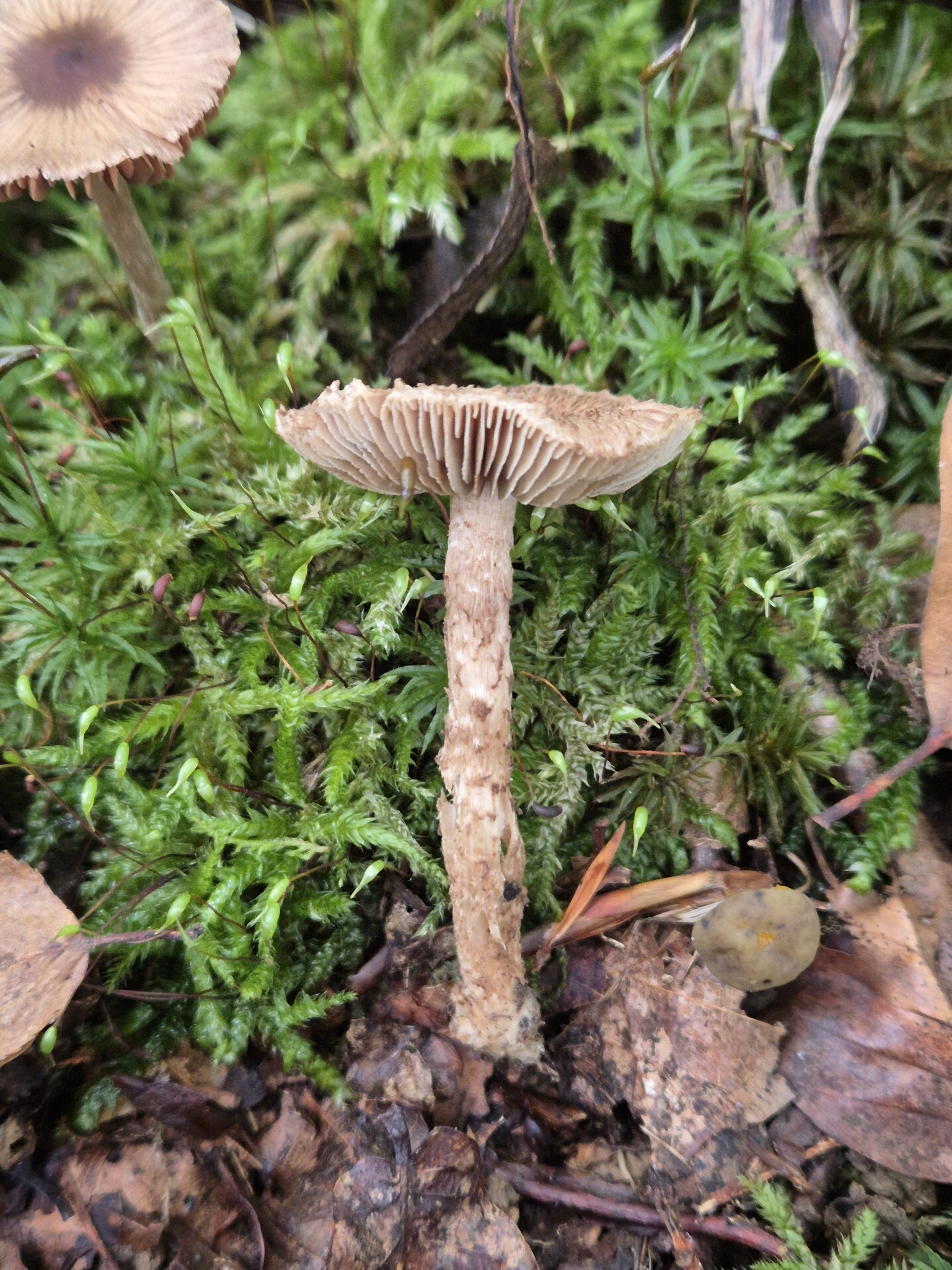 Hut: halbkugelig bis flach gewölbt, schwach gebuckelt, mit braunen, dornartig spitzigen, sparrigen Schuppen auf beigeocker Grund.