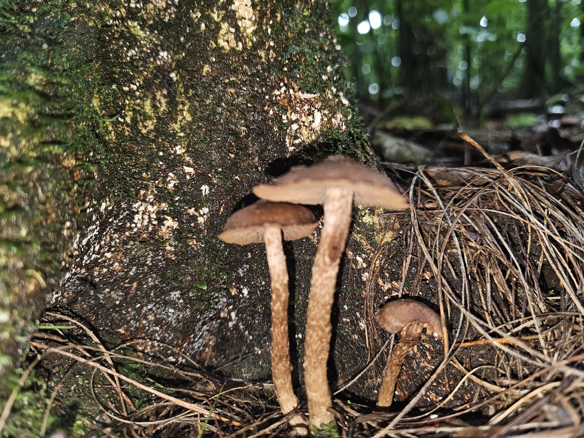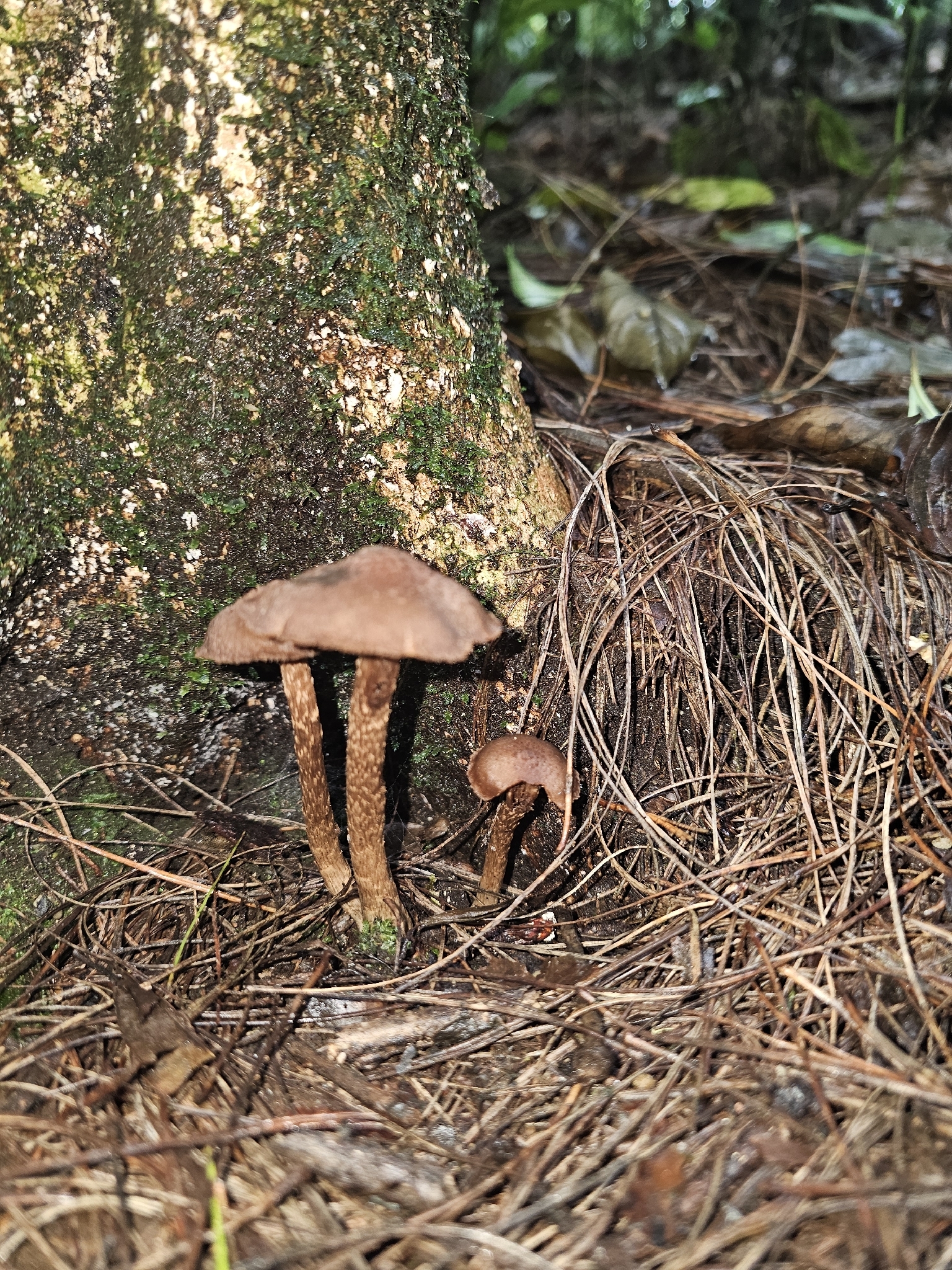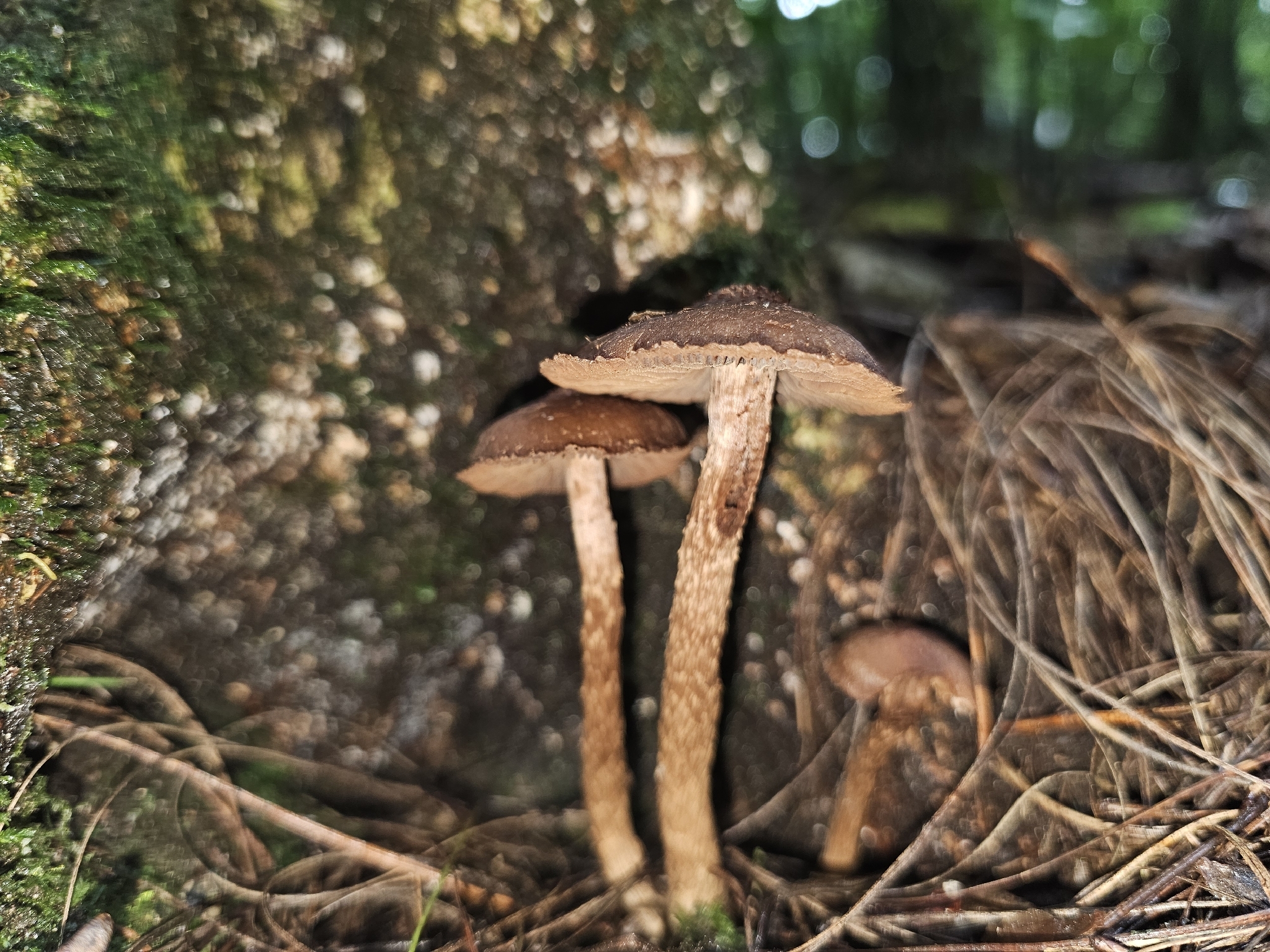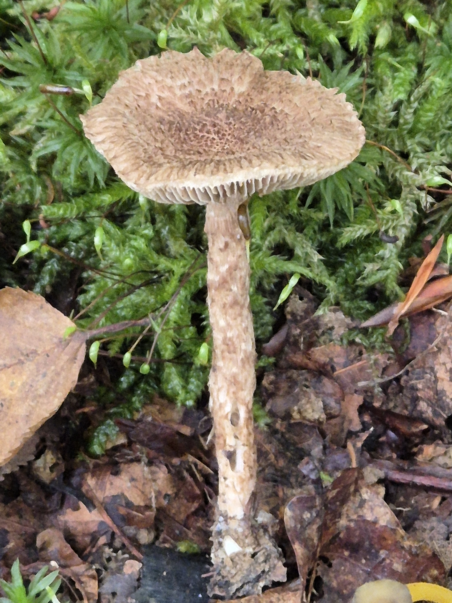 Stiel: voill, fest, verdickt, ringförmig gezont, mit sparrig rückgekrümmten flockigen Schuppen bedeckt, gefärbt wie der Hut in mäusegrau.