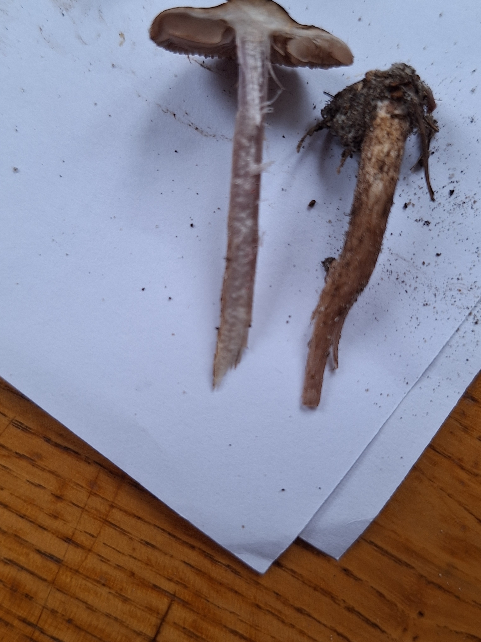 Stiel: relativ lang, zylindrisch, Spitze lila und weisslich flockig, im unteren Teil braun wollig-faserig bis fast eingesponnen, Basis meist etwas verjüng, flüchtiger Haarschleier.