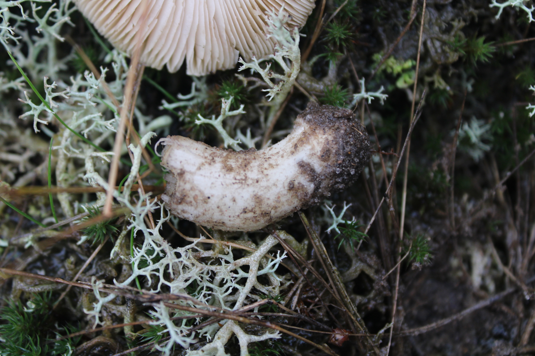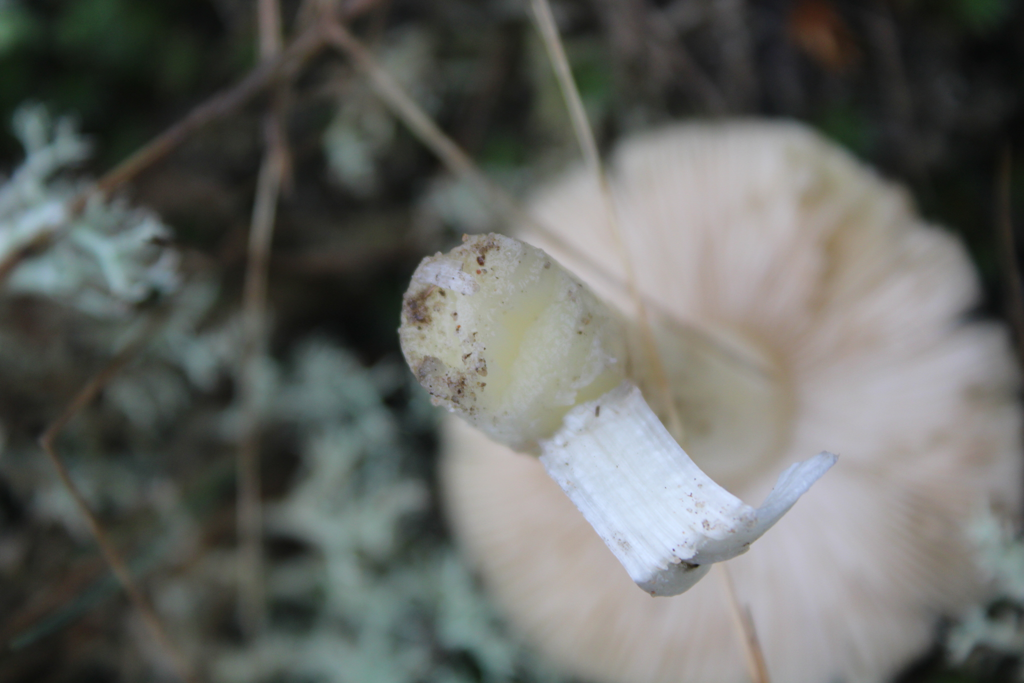 Stiel: stämmig, voll, aufgedunsen, oft niederliegend, weisslich, feinfaserig bis rillig, Spitze bereift, Basis bis schwach verdickt, oft tief im Sand steckend.