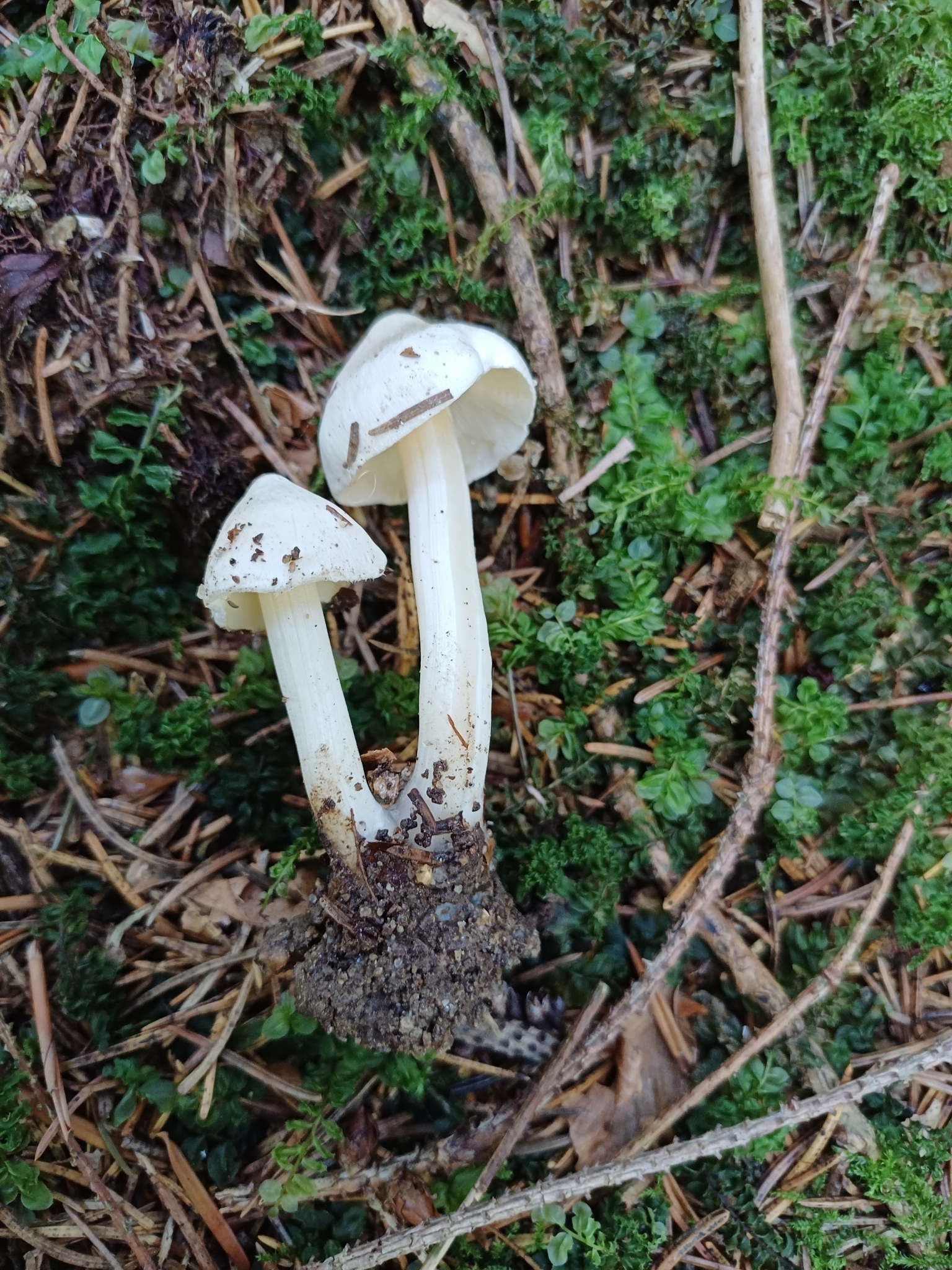 Stiel: wie der Hut gefärbt, Basis verdickt mit weissem Mycelfilz, wodurch der Eindruck einer gerandeten Knolle vermittelt wird, Spitze kleiig bestäubt.