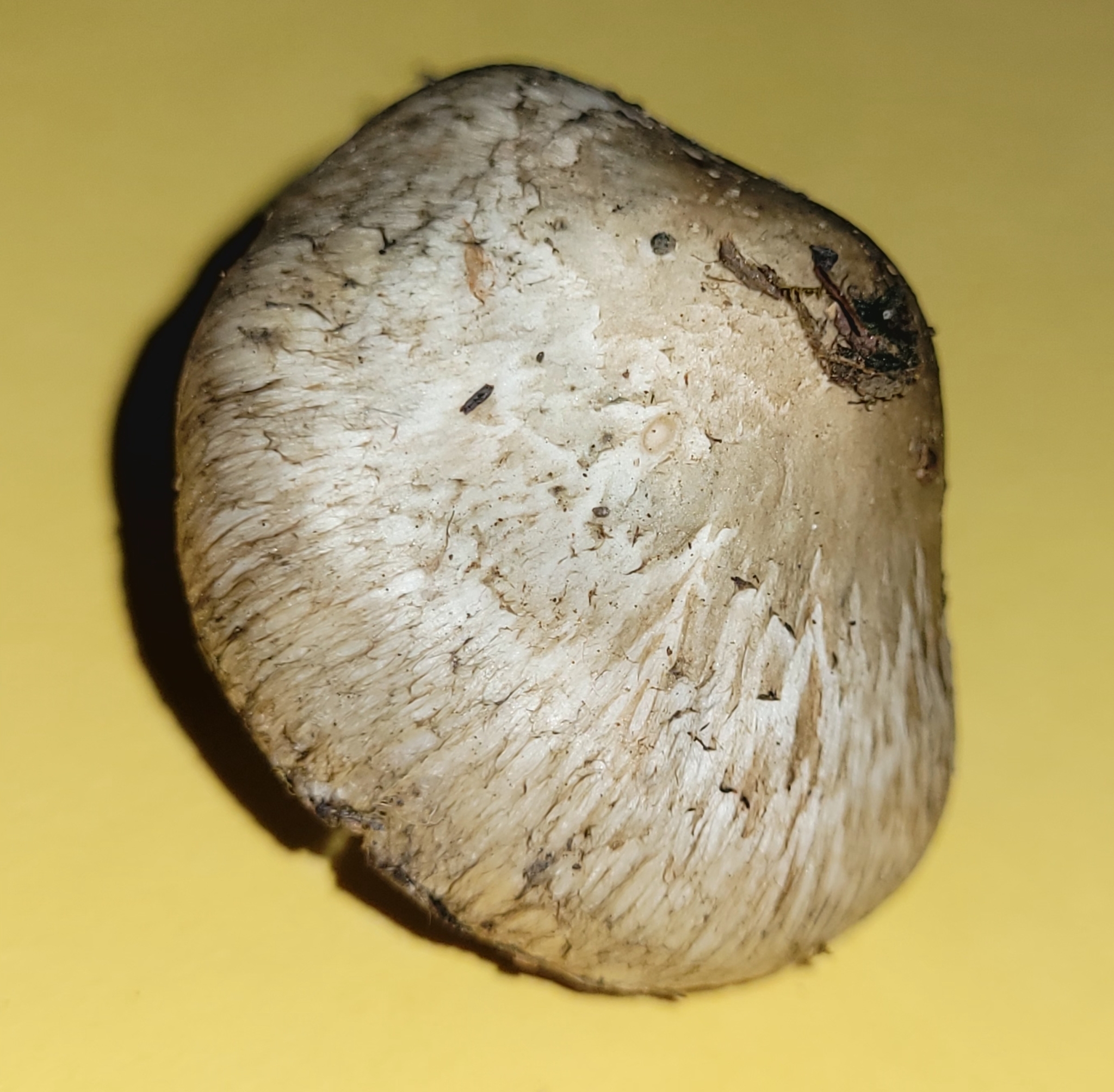 Lamellen: ausgebuchtet, schmal angeheftet, creme, später ockerbraun mit leichtem Grünton, u.U. fein rostfleckig, Schneiden fein weisslich bewimpert.