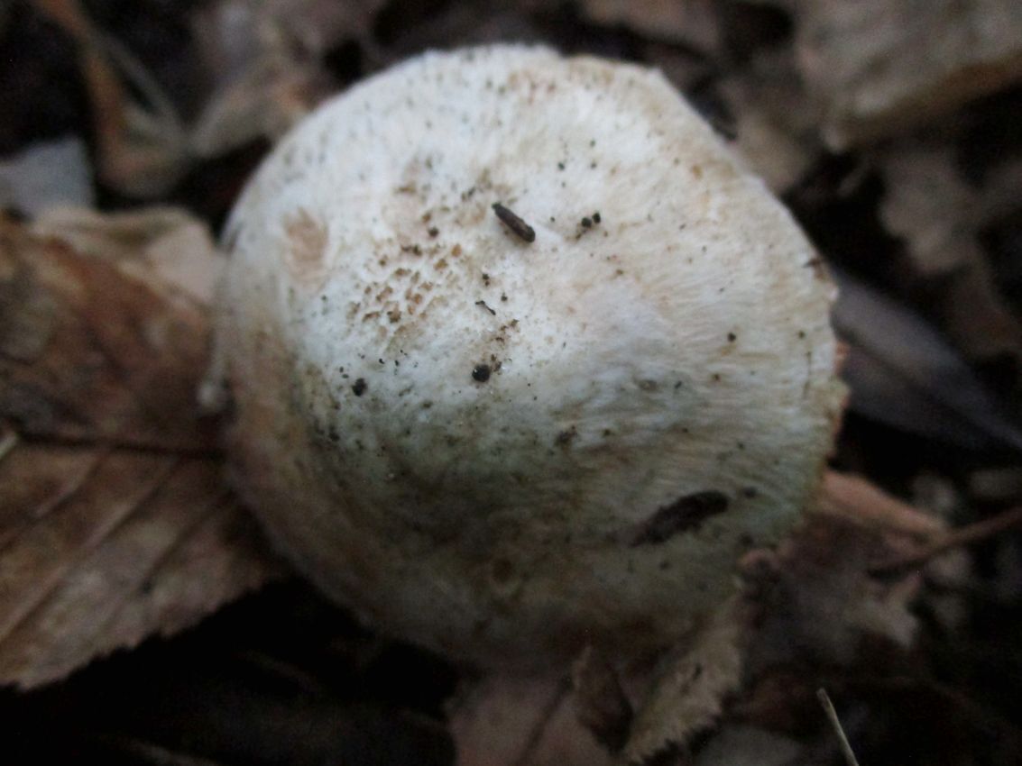 Hut: jung kegelig, später flach gewölbt, gebuckelt, am Scheitel grünlich, gegen den Rand bleicher beigeocker bis beigegrau, Rand überstehend oder faserig behangen