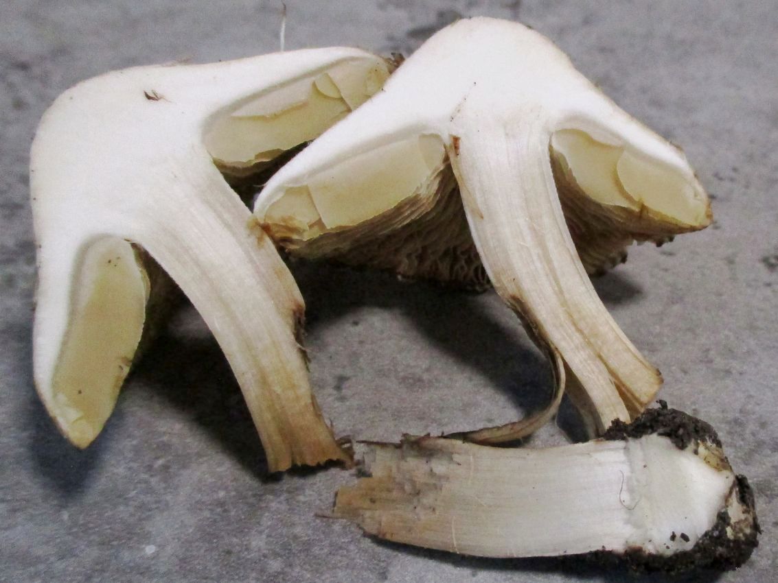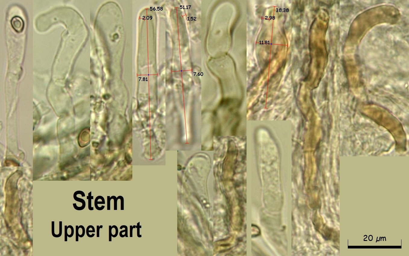 Stiel: zylindrisch, Spitze fast weisslich blass, flockig, zur Basis bräunlich, faserig, Basis schwach verdickt, oft grünlich.