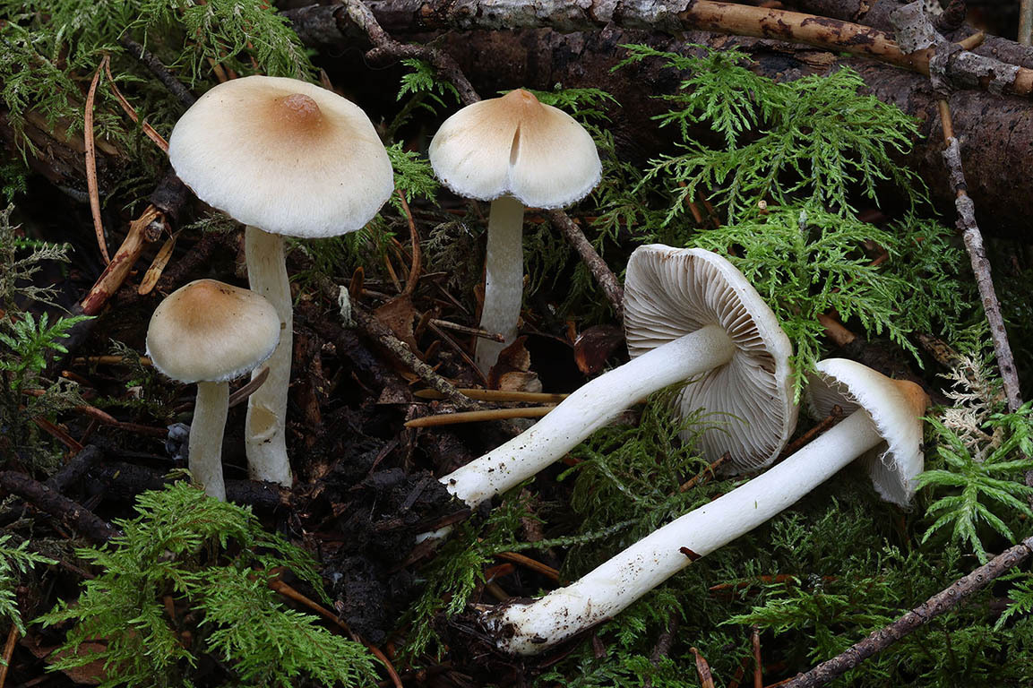 Lamellen: schmal angeheftet, blass weisslich bis graubeige, fast gedrängt, später satt graubeige bis bräunlich, Schneide weissflockig.