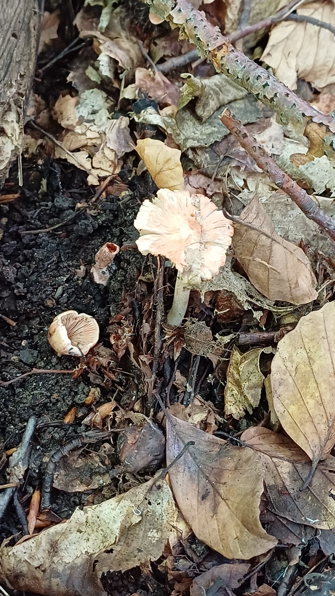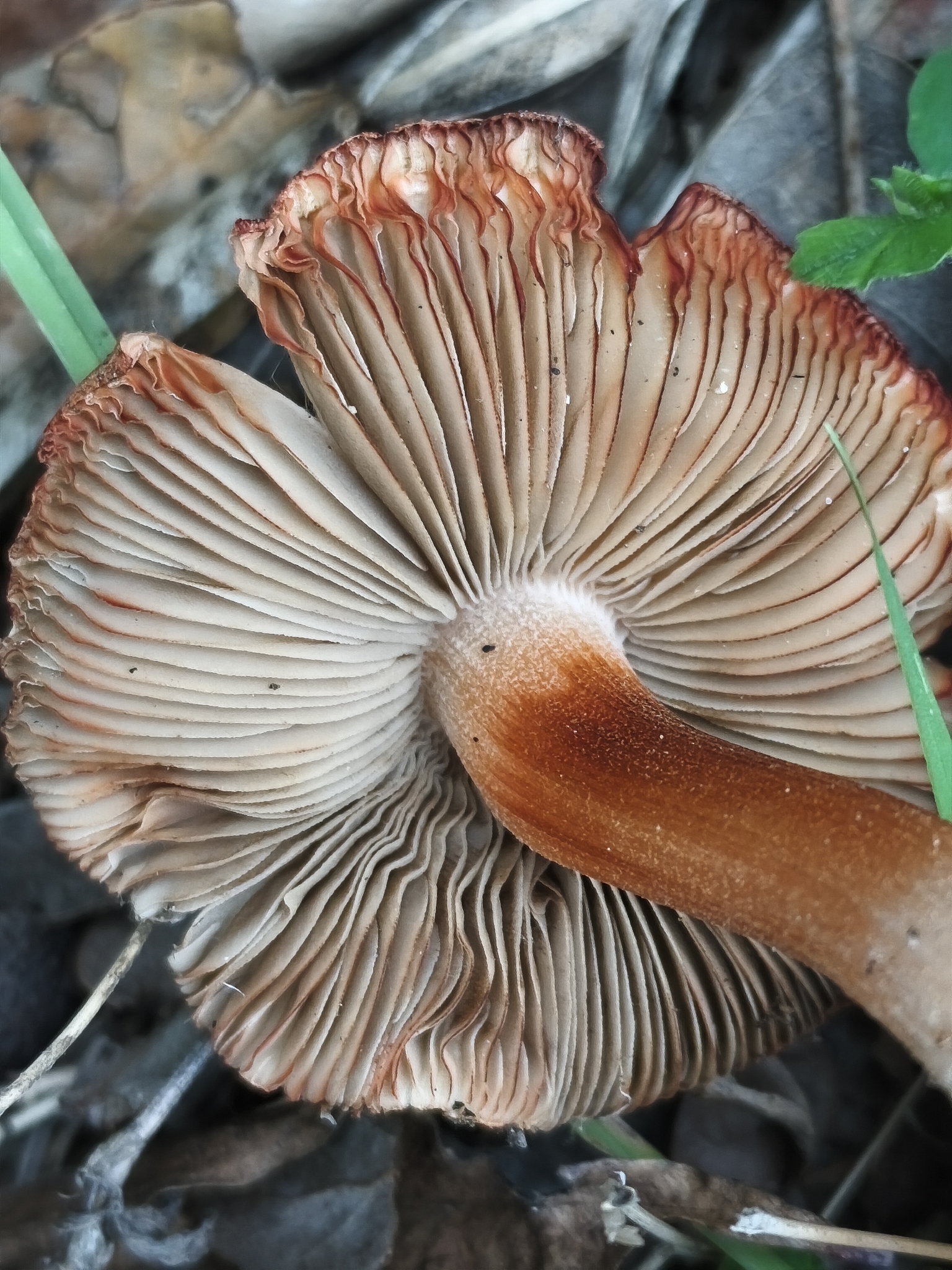 Lamellen: ausgebuchtet und schmal angewachsen, grauweisslich, beige bis schmutzigocker, Schneiden bewimpert, alt schartig und rötlich.