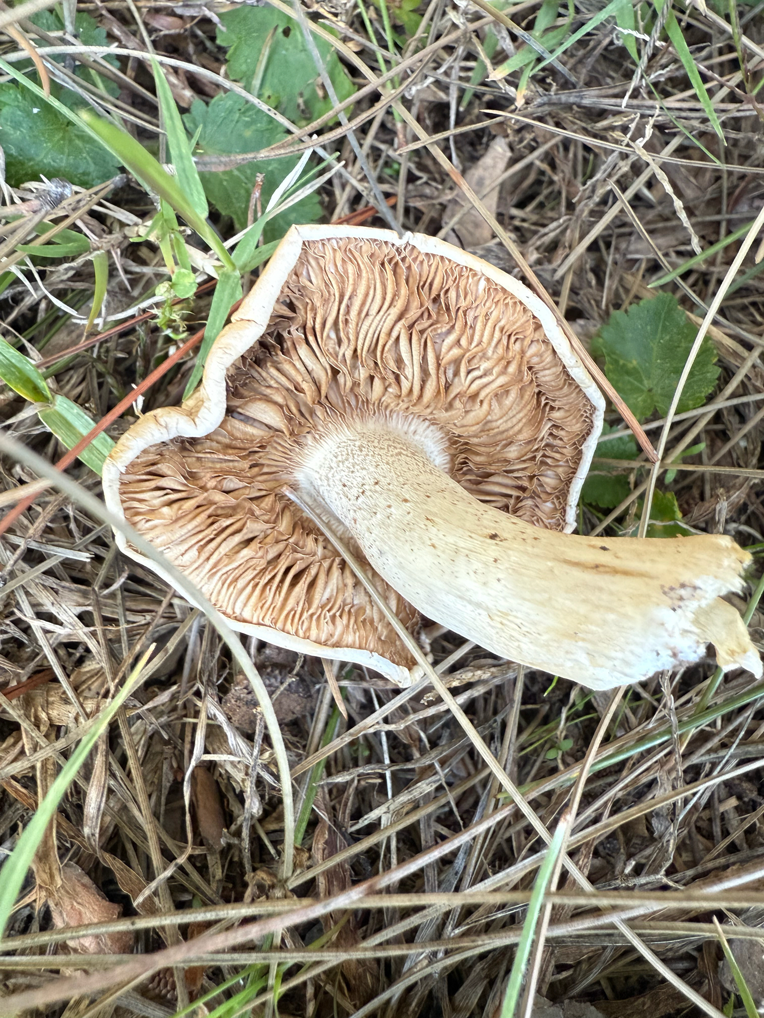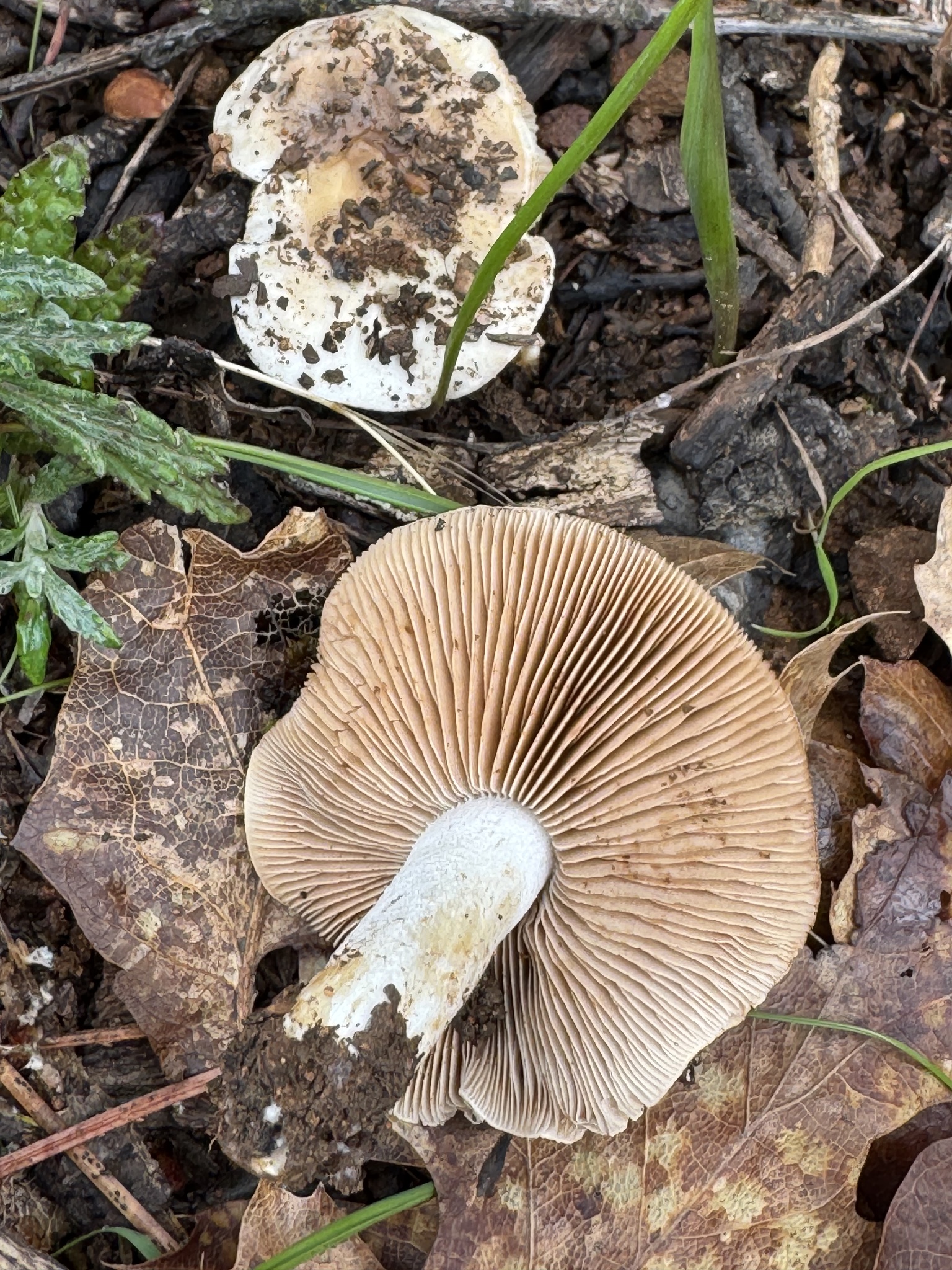Lamellen: ausgebuchtet, angewachsen, dicht, blass bis graubraun, Schneiden gekerbt und weiss, jung tränend, später mit dunklen Flecken.