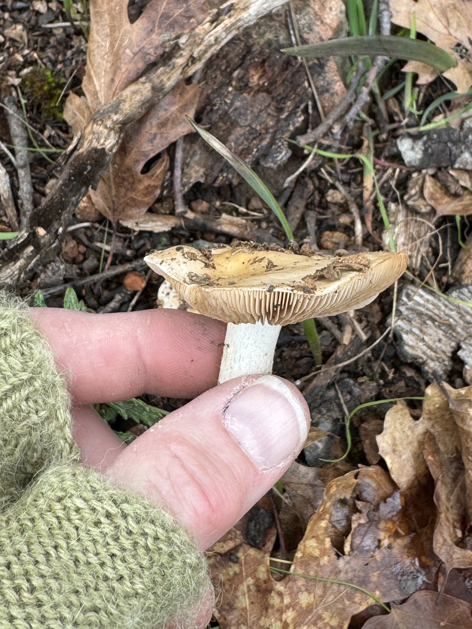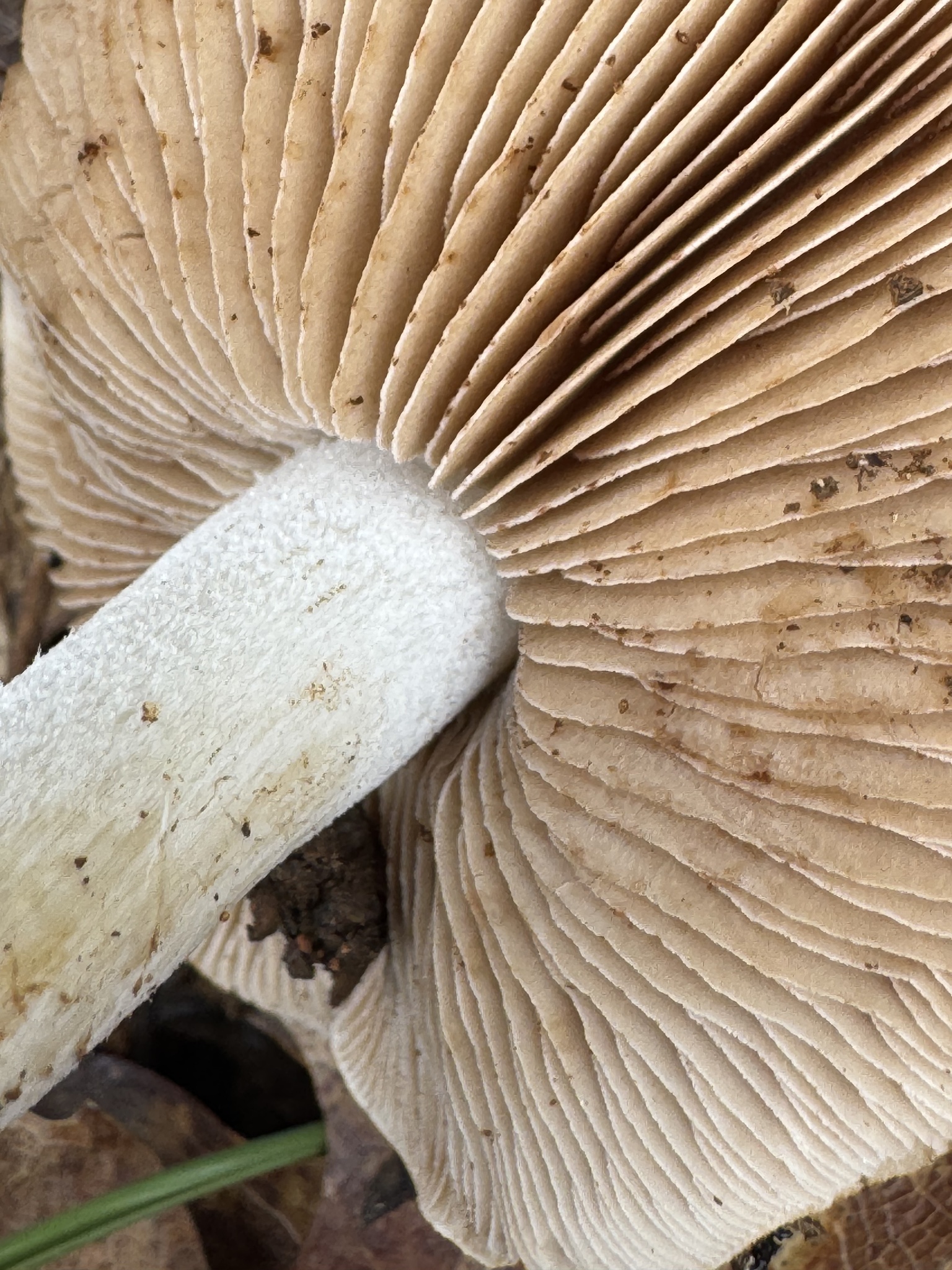 Stiel: zylindrisch, befasert, weisslich, Spitze flockig weiss, Basis evtl. verdickt und mit Mycelfäden