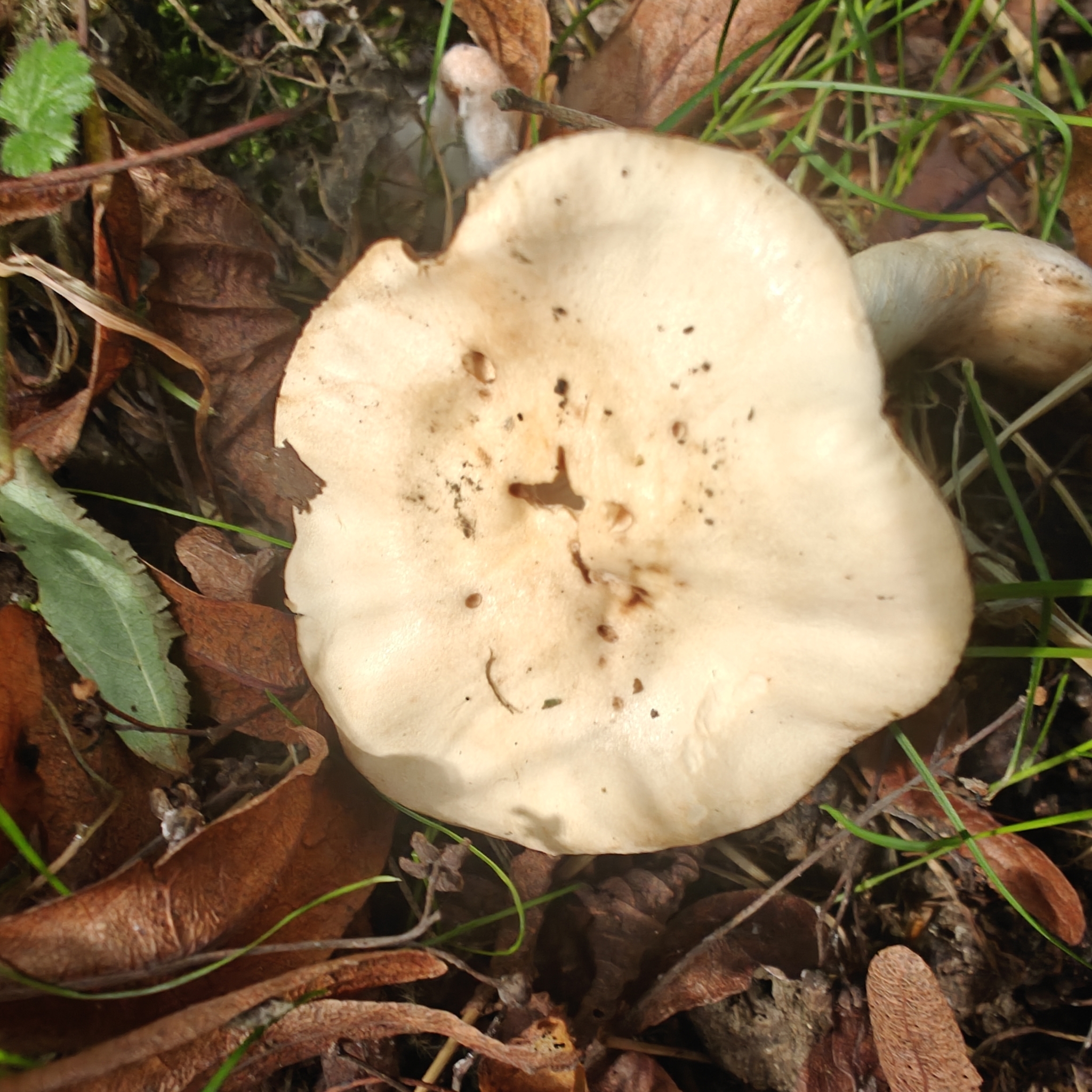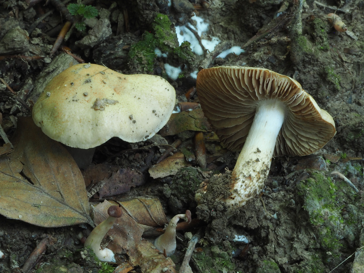 Hut: jung gewölbt, bald ausgebreitet, klebrig, weisslich bis blass cream, schmierig bei Nässe, im Alter dunkelnd zu Ocker graubraun, Mitte u.U. mit Buckel