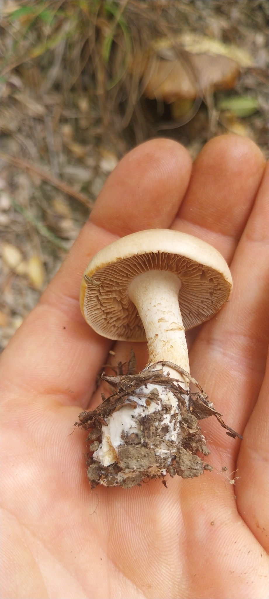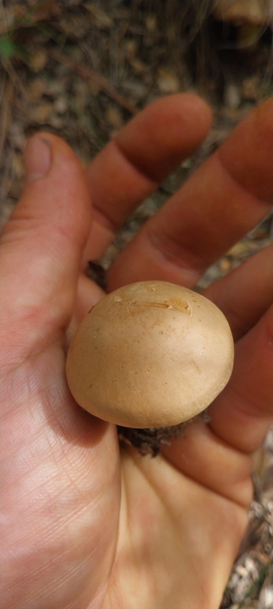 Hut: halbkugelig konvex, cremeocker, ockerbräunlich, Rand lange eingerollt, gekerbt.