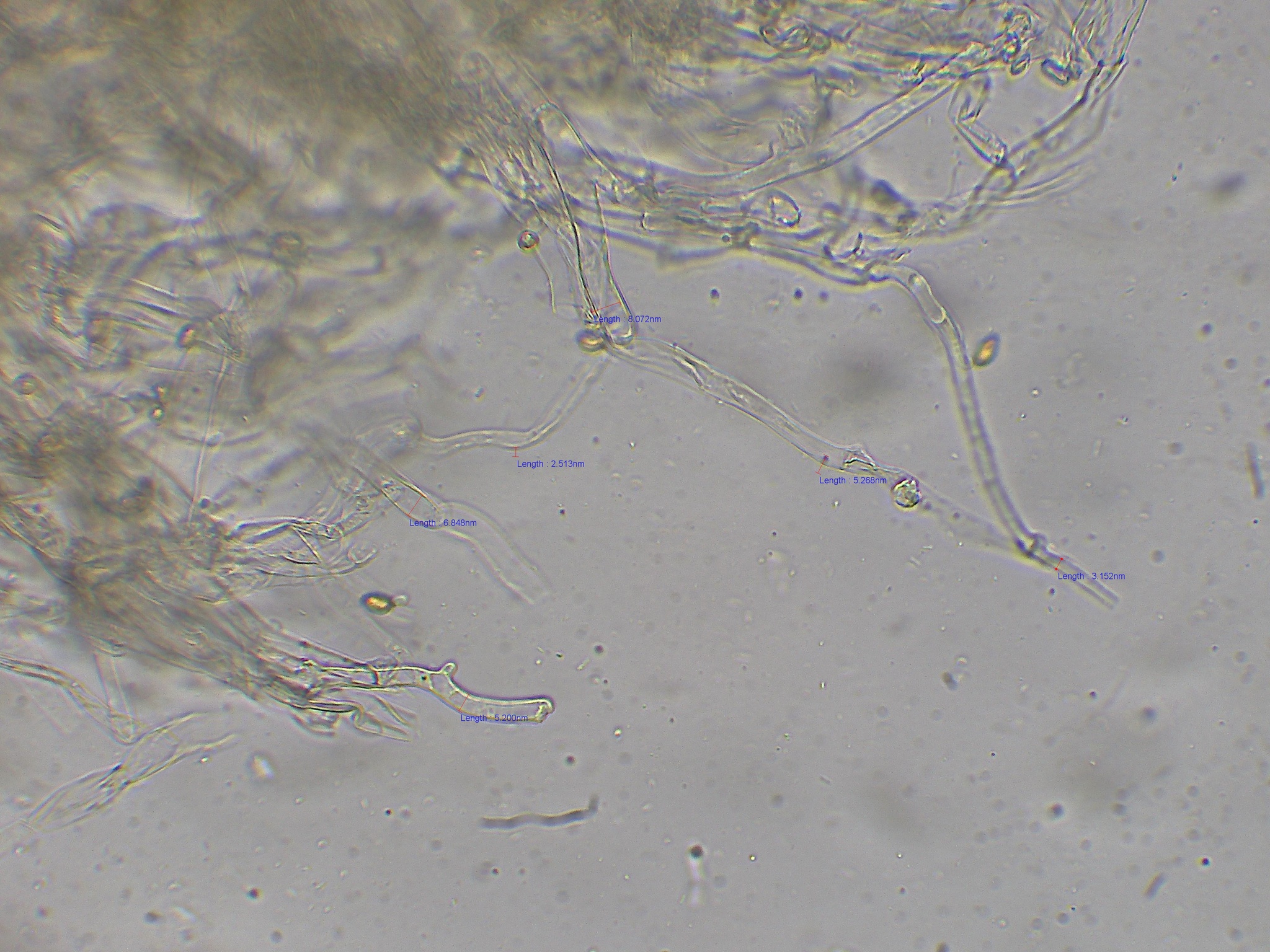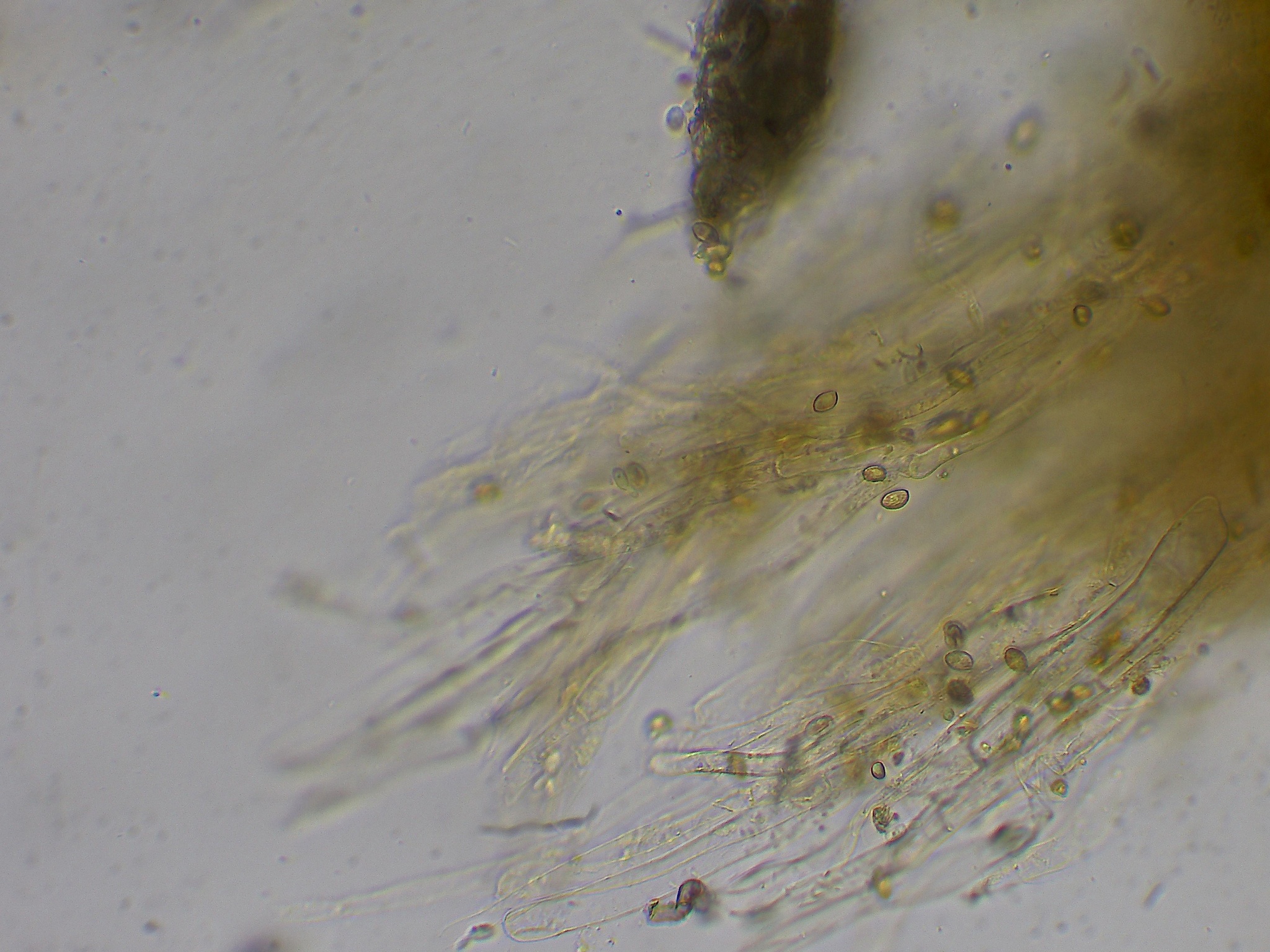 Stiel: zylindrisch bis leicht erweitert zur Basis, blassgelblich, heller als Hut, flüchtige weissliche, faserige Cortinareste