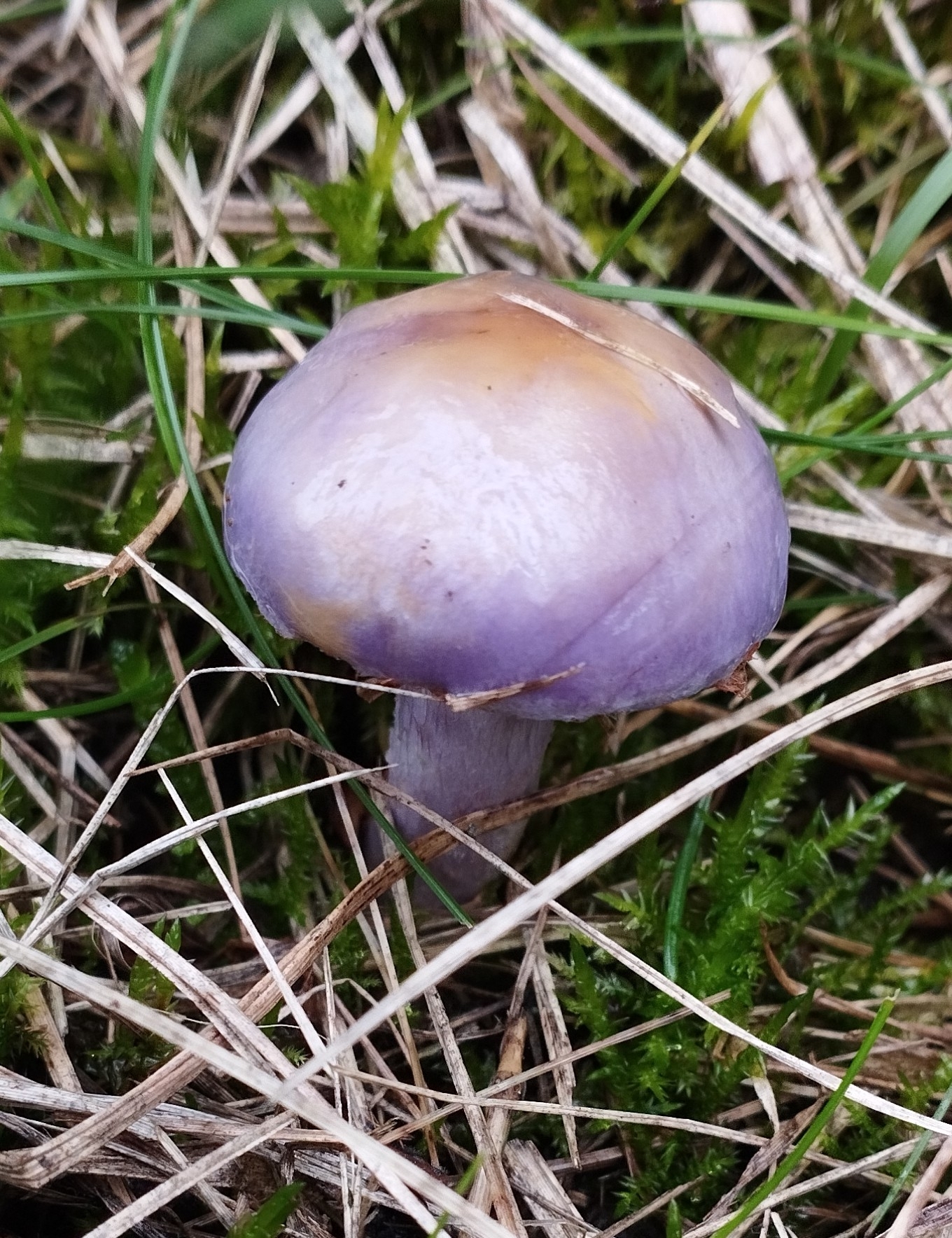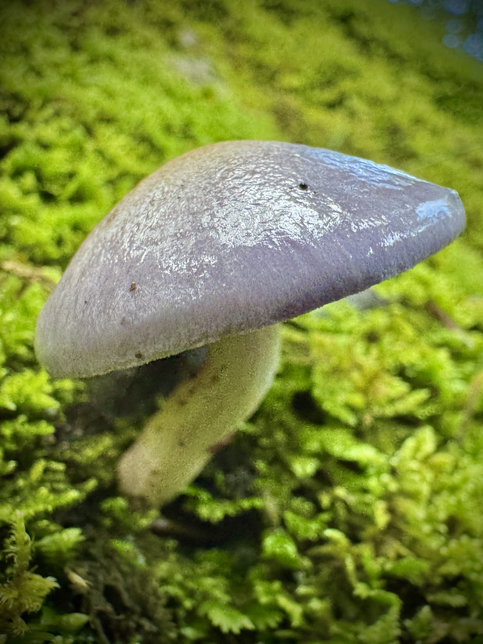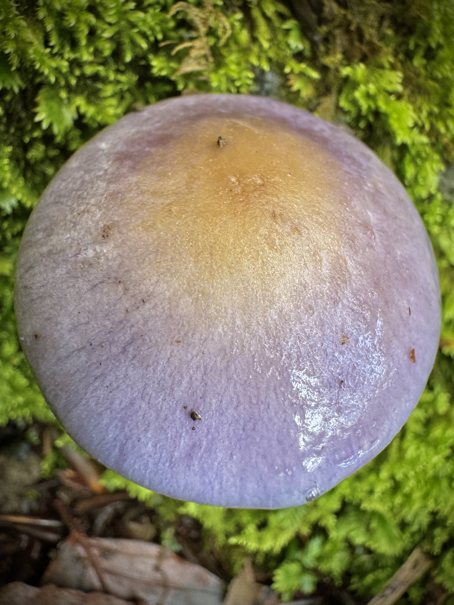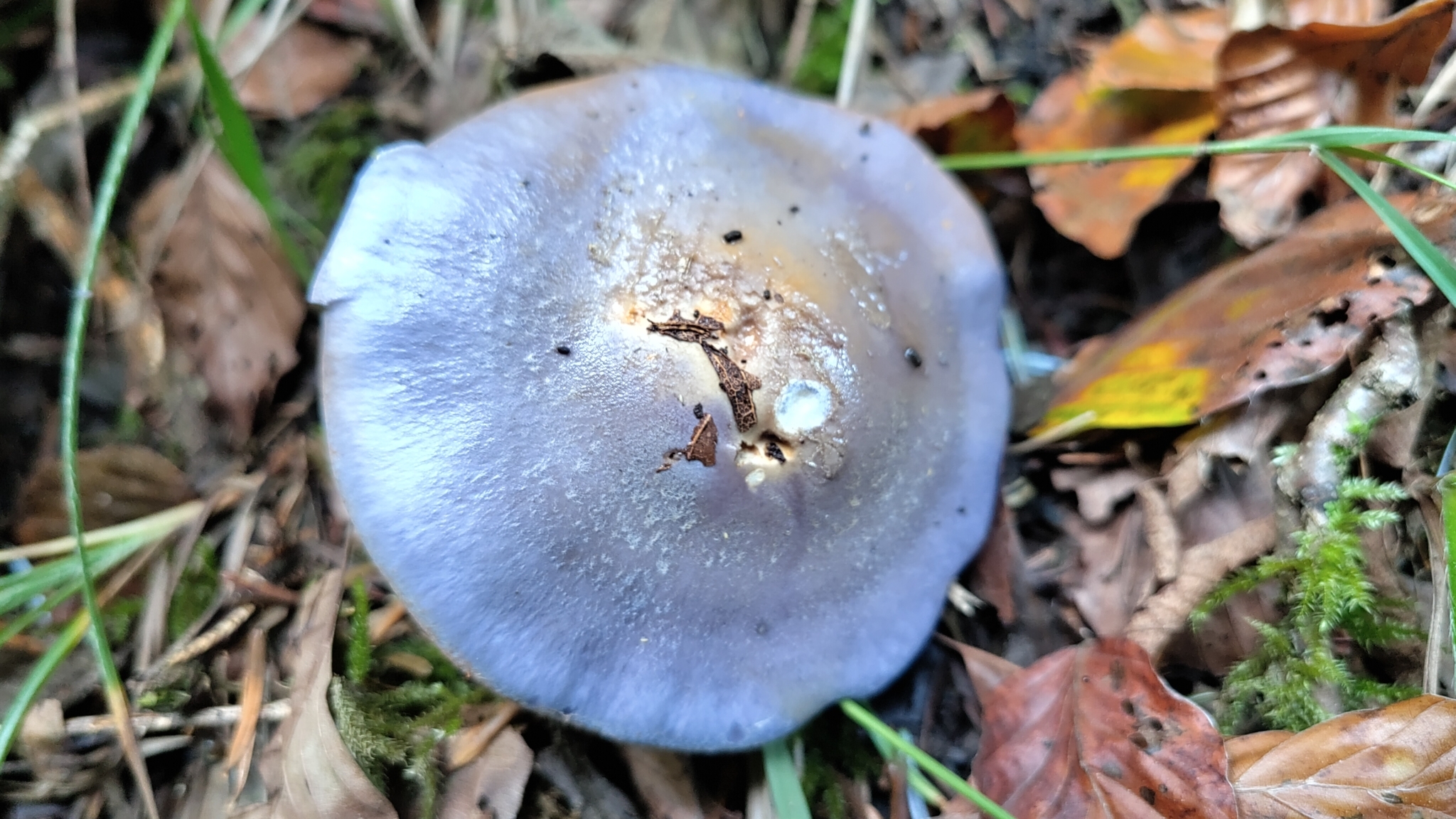 Hut: jung rundlich, dann flach gewölbt bis flach, schleimig, erst tief lilablau bis violett, von der Mitte her zunehmend ausbleichend bis gelblichgrau oder olivocker,