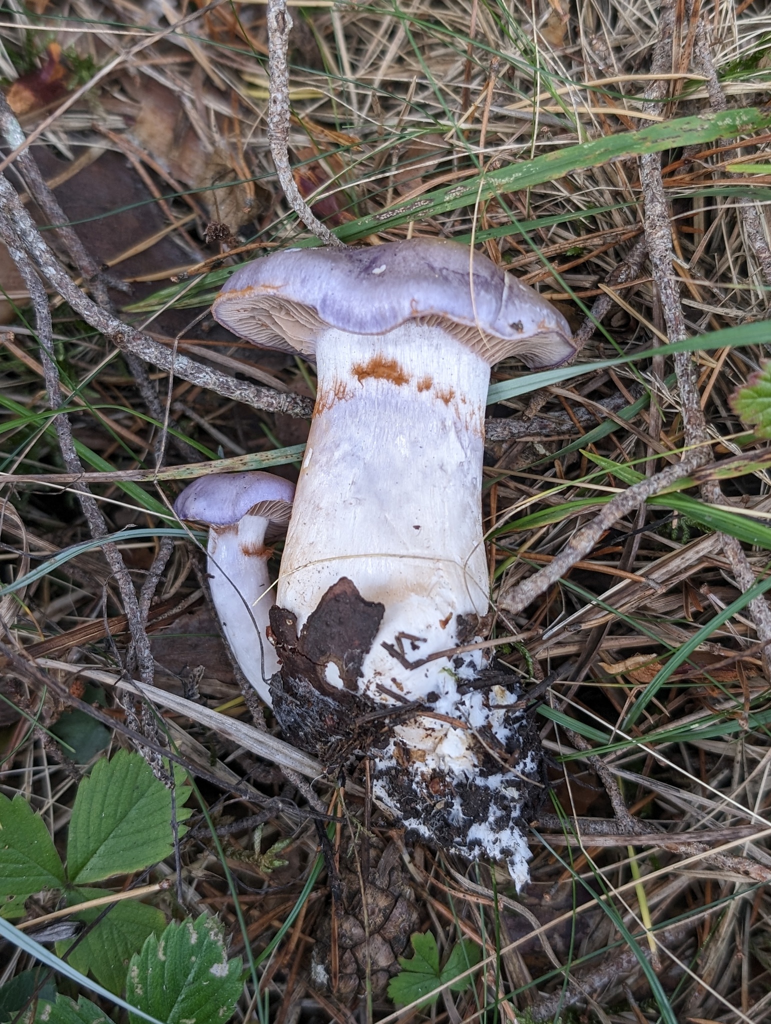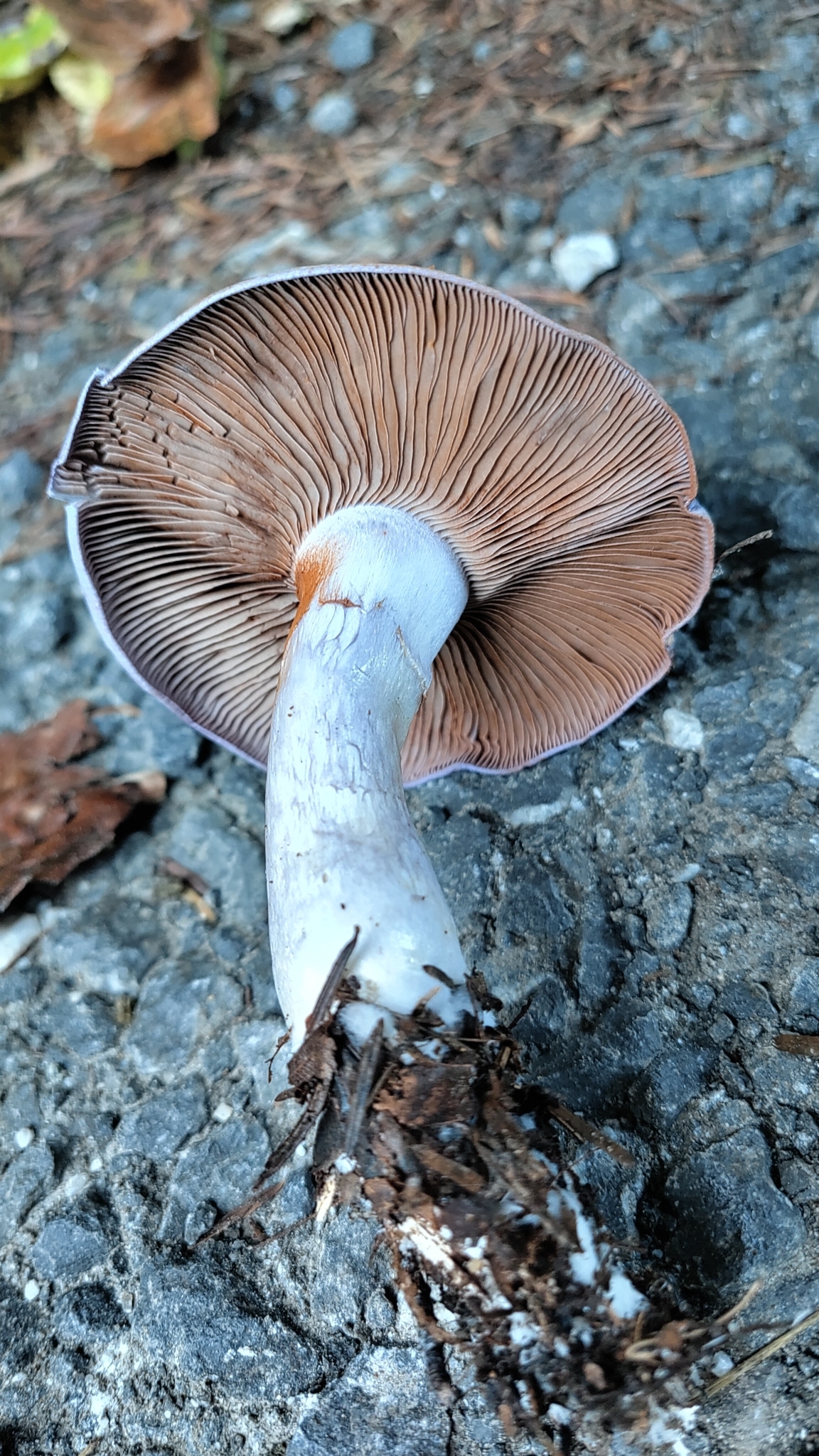 Stiel: schleimig, weisslich oder blass lila-violett, Basis keulig bis ca. 3 cm verdickt, Velum lilablau, später grau-olivgelb,, schwach gürtelförmig.