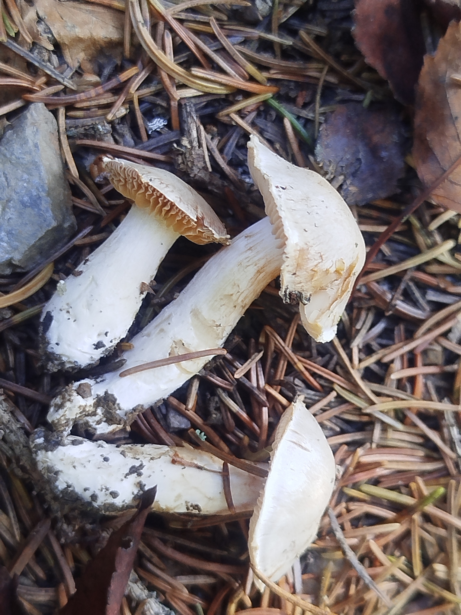 Stiel: schlank, schleimig, weisslich bis blassocker, Velum weisslich bis gelboliv, Basis manchmal verdickt.