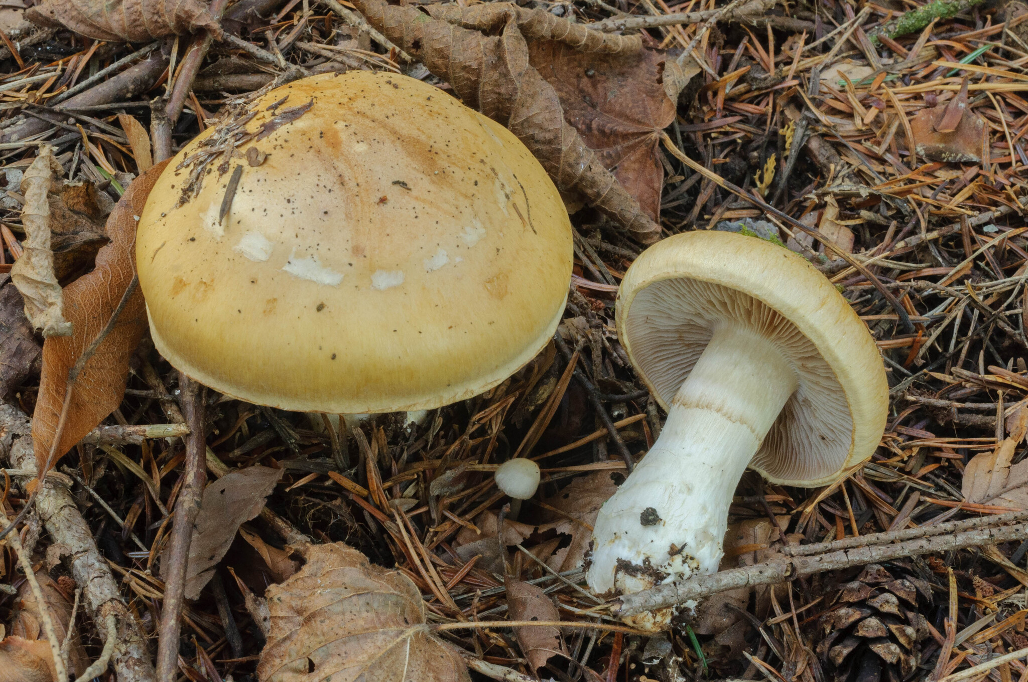 Hut: jung halbkugelig, dann flach ausgebreitet, fest, schleimig, oft schuppig zerklüftet, gelb bis ockerbraun, Randzone oft mit weissen Velumresten, im Alter radial gerunzelt.