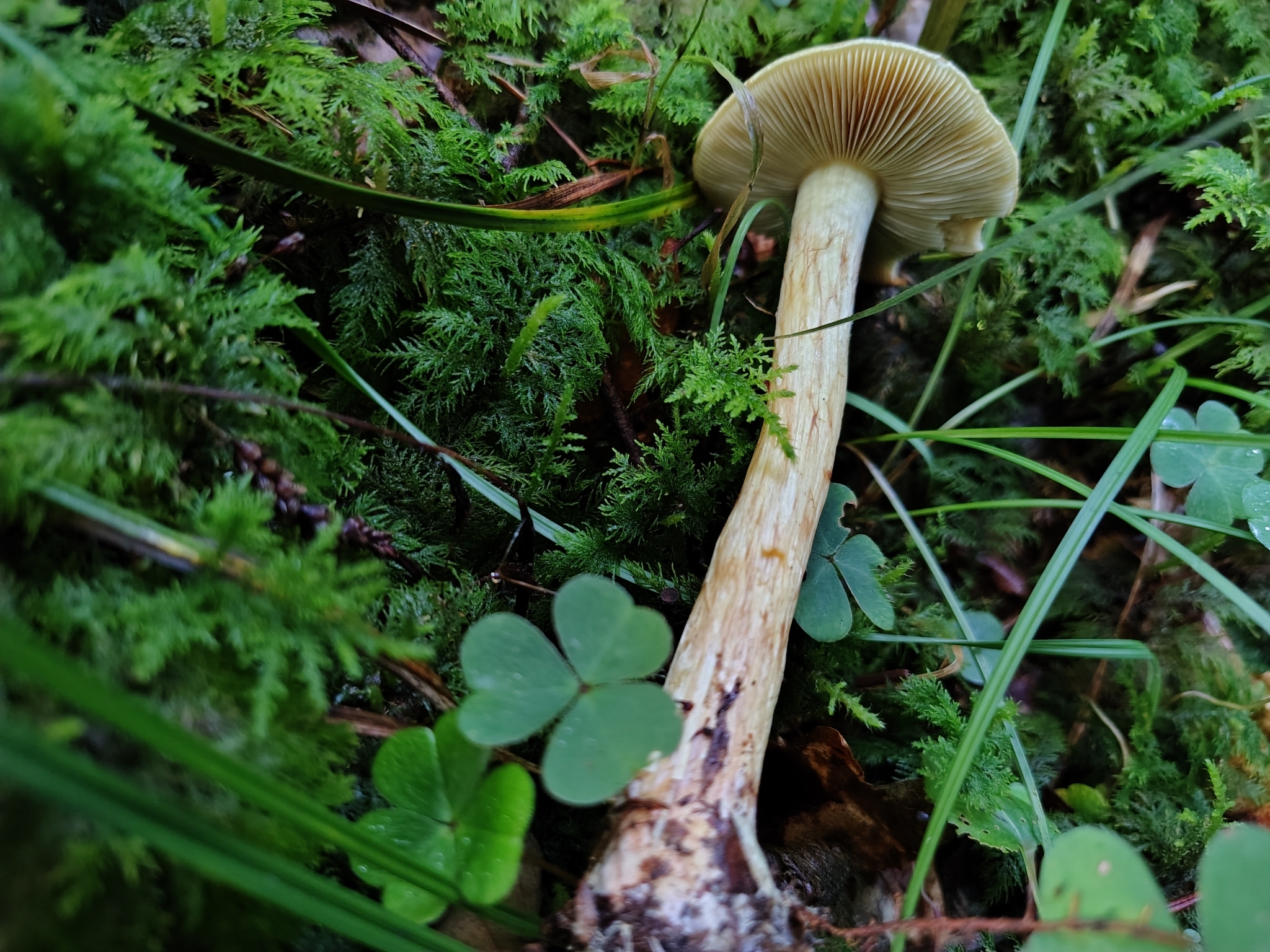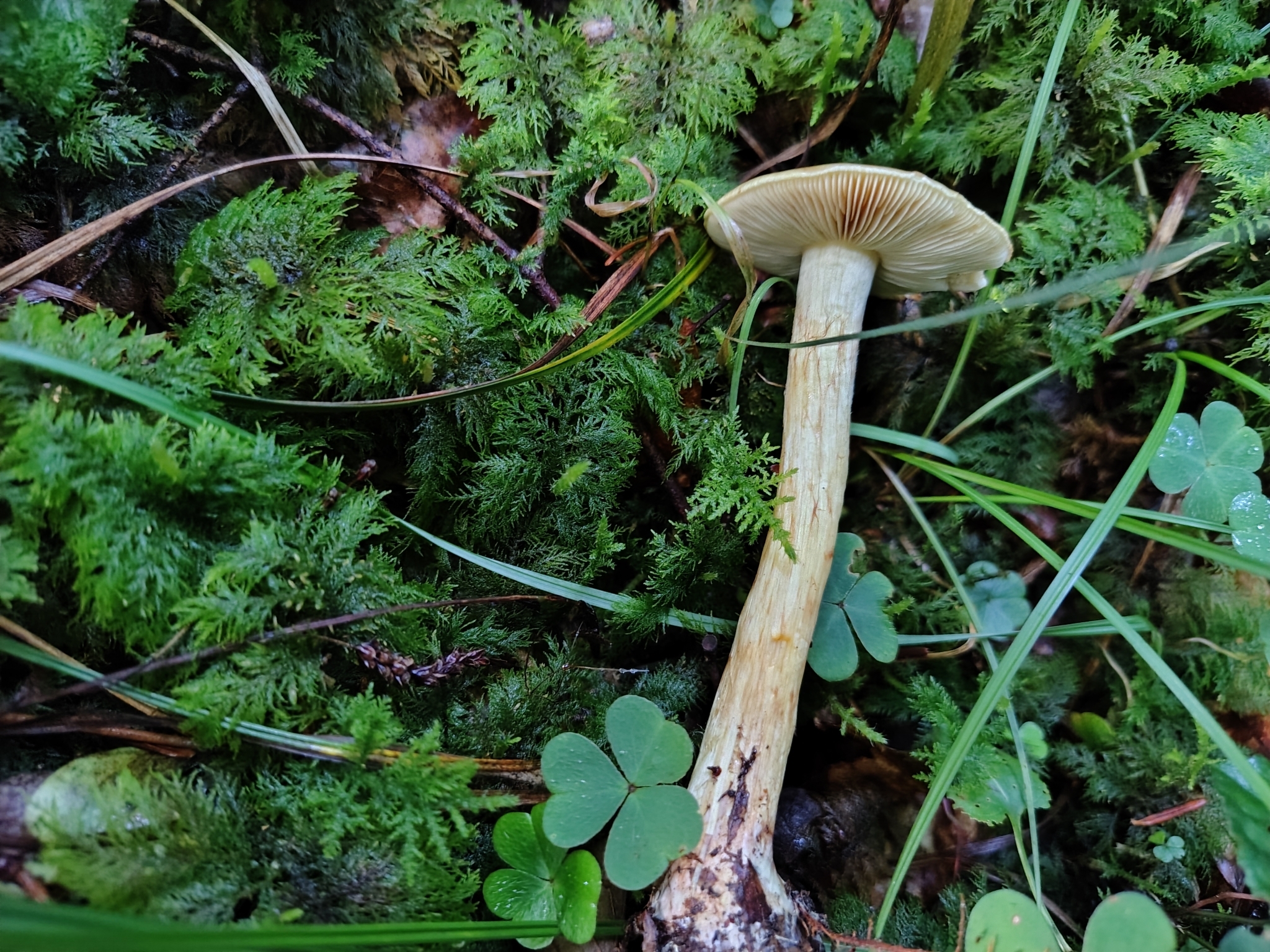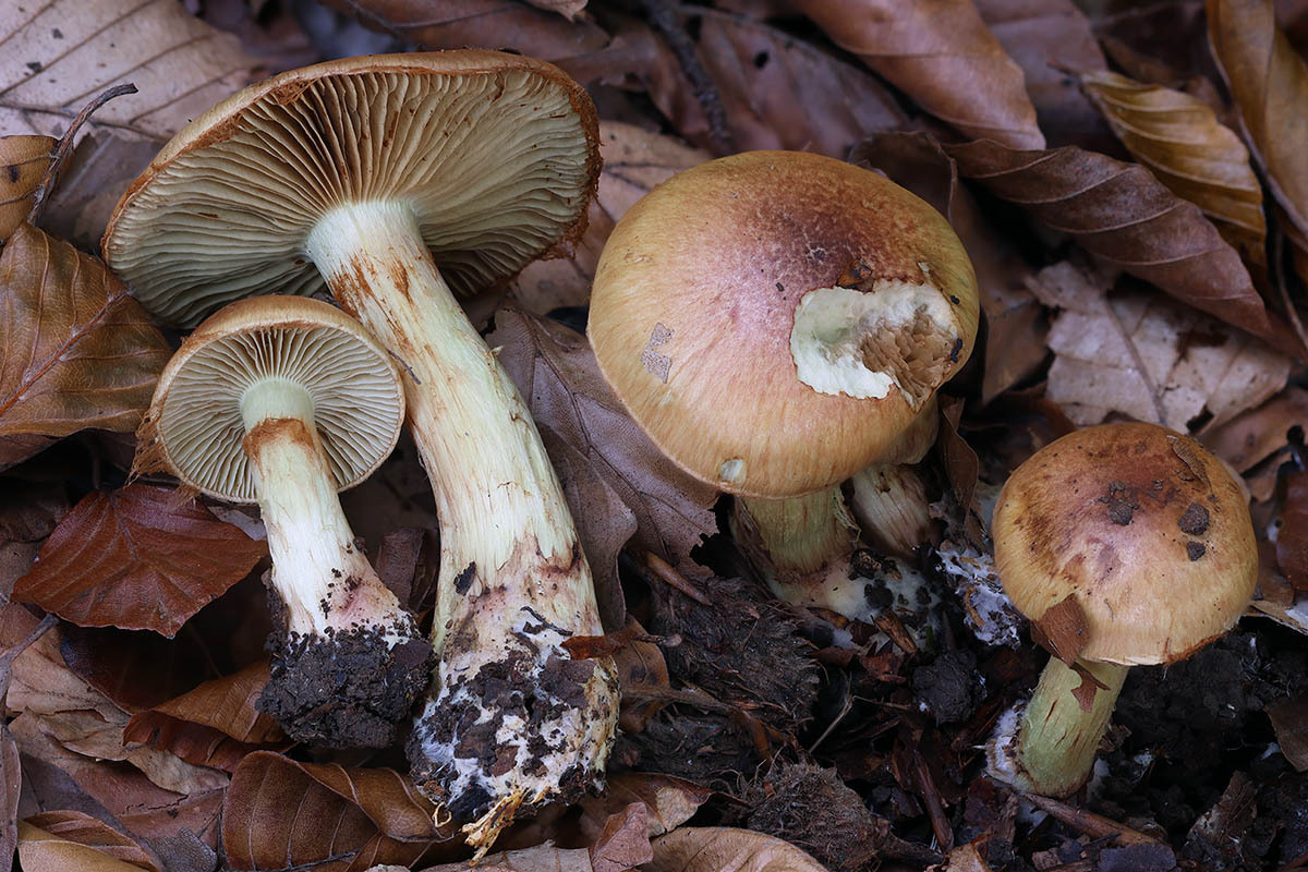 Stiel: gelb bis gelbgrünlich, zur Basis mit bräunlichen Velumresten gezont, Basis auch knollig verdickt.