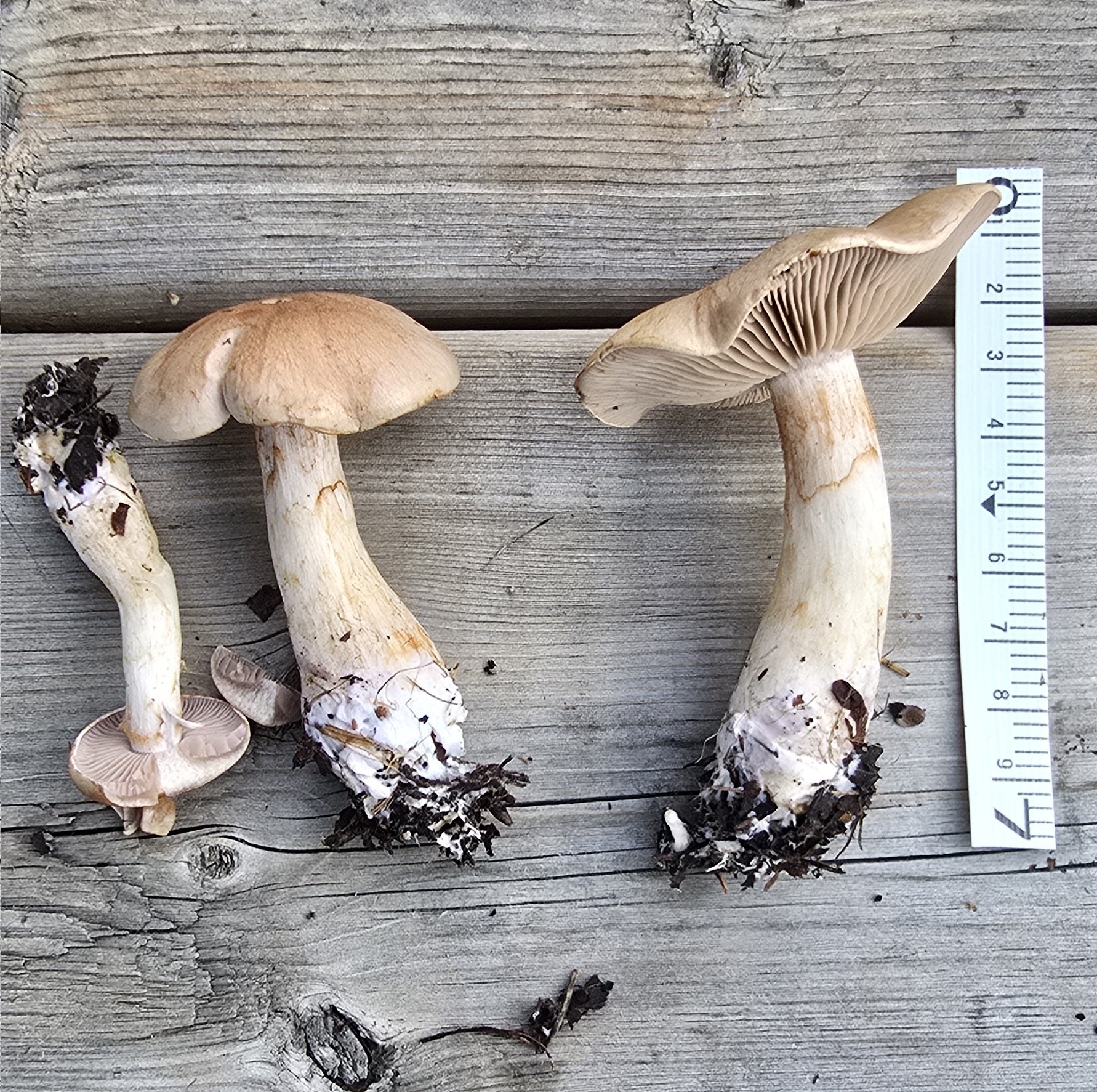 Stiel: zylindrisch, Basis verdickend oder auch mit ca. 2,5 cm dicker Knolle, olivgrau, ockerbraun bis weisslich, Spitze bisweilen mit Blauton,